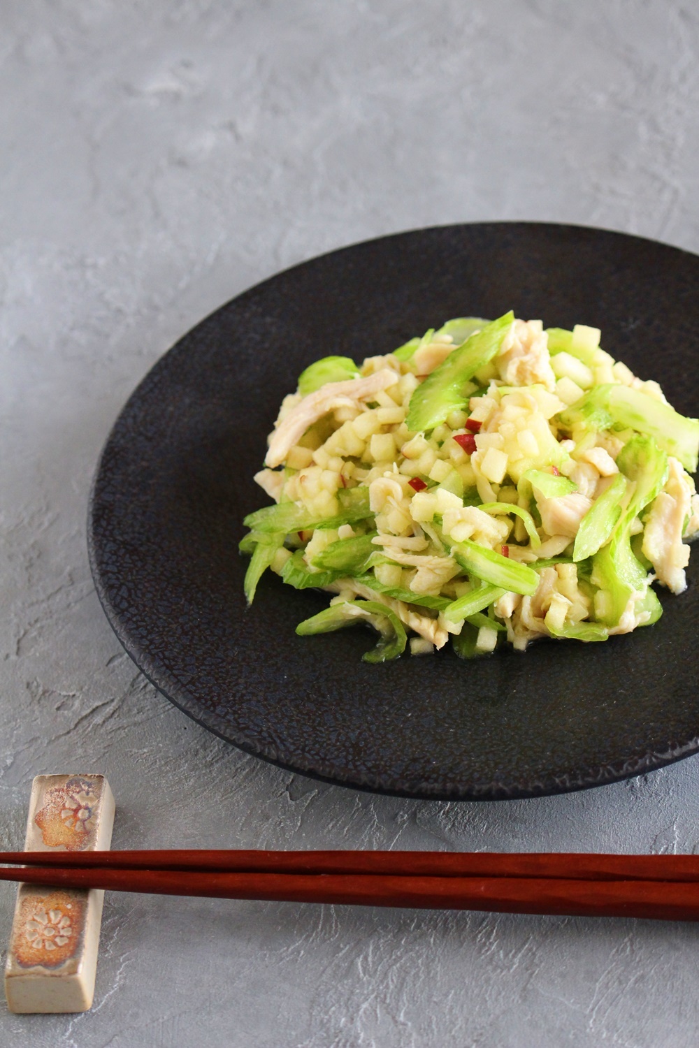 人気のサラダチキンにセロリとりんごを合わせたサラダです。ドレッシングに使ったわさびが味のアクセントです。