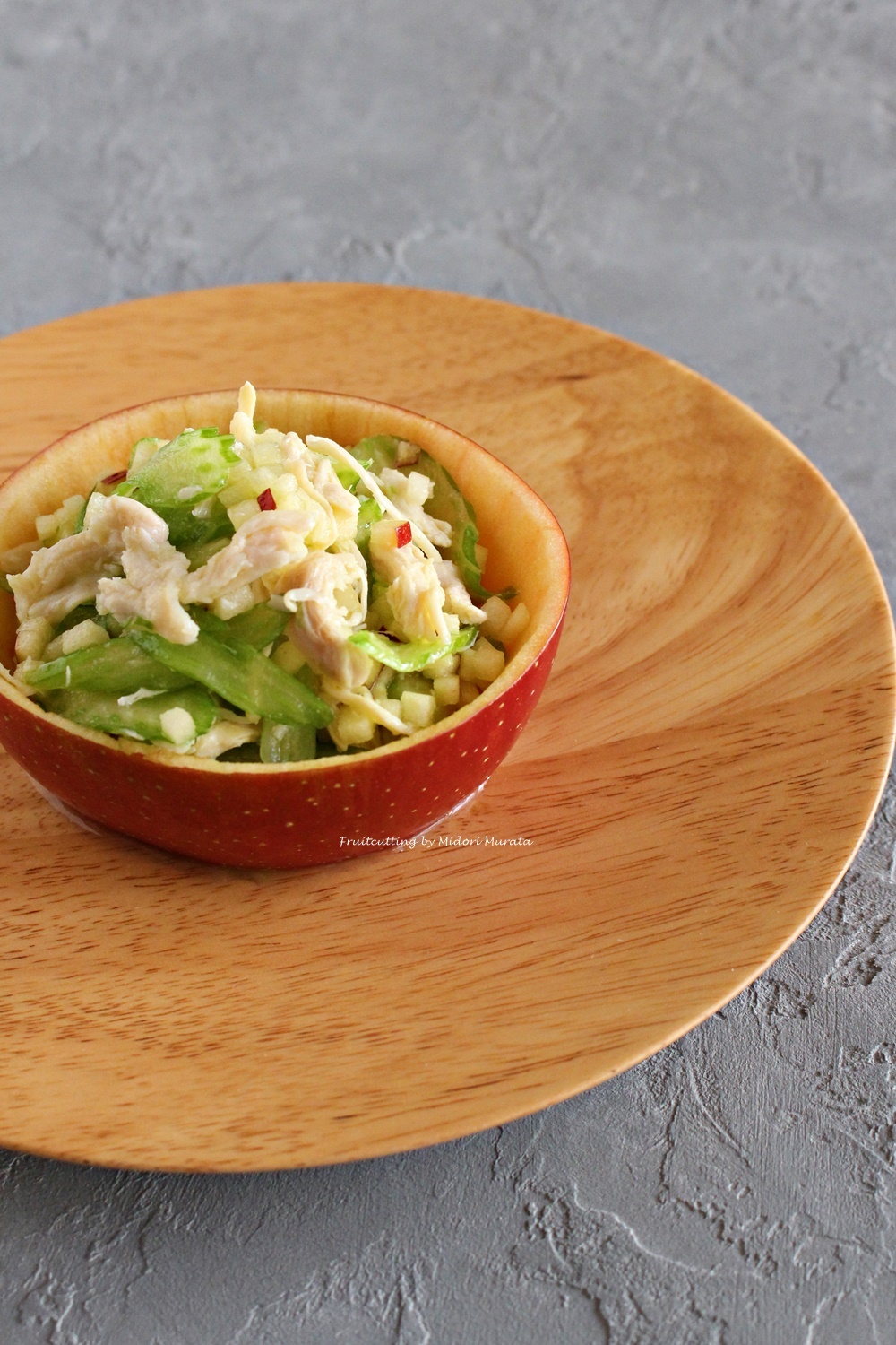 - ボウルにりんご酢、生わさび、塩を入れて混ぜ、エクストラバージンオリーブオイルを入れて混ぜ、①とサラダチキンを加えて和え器に盛る。