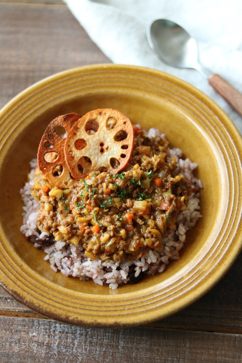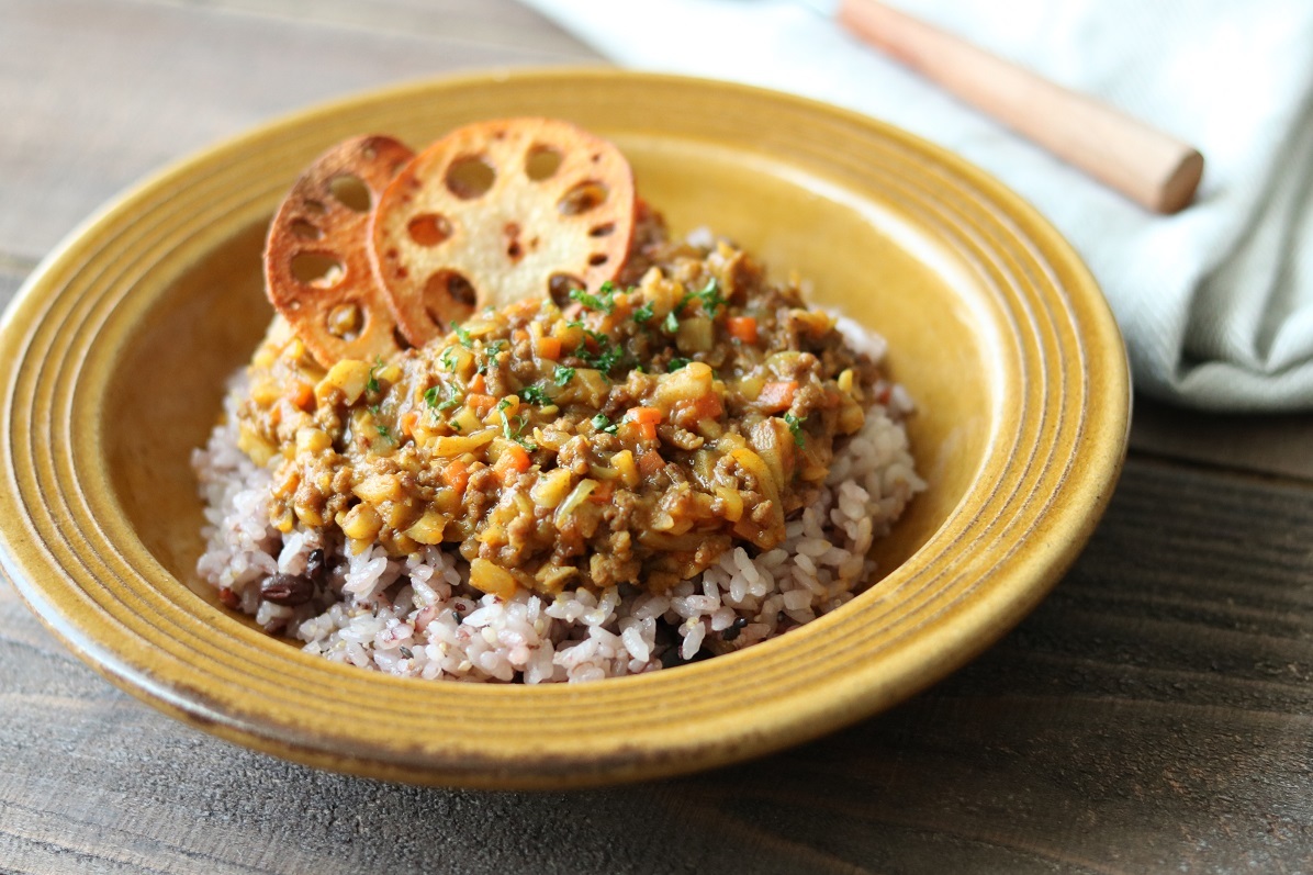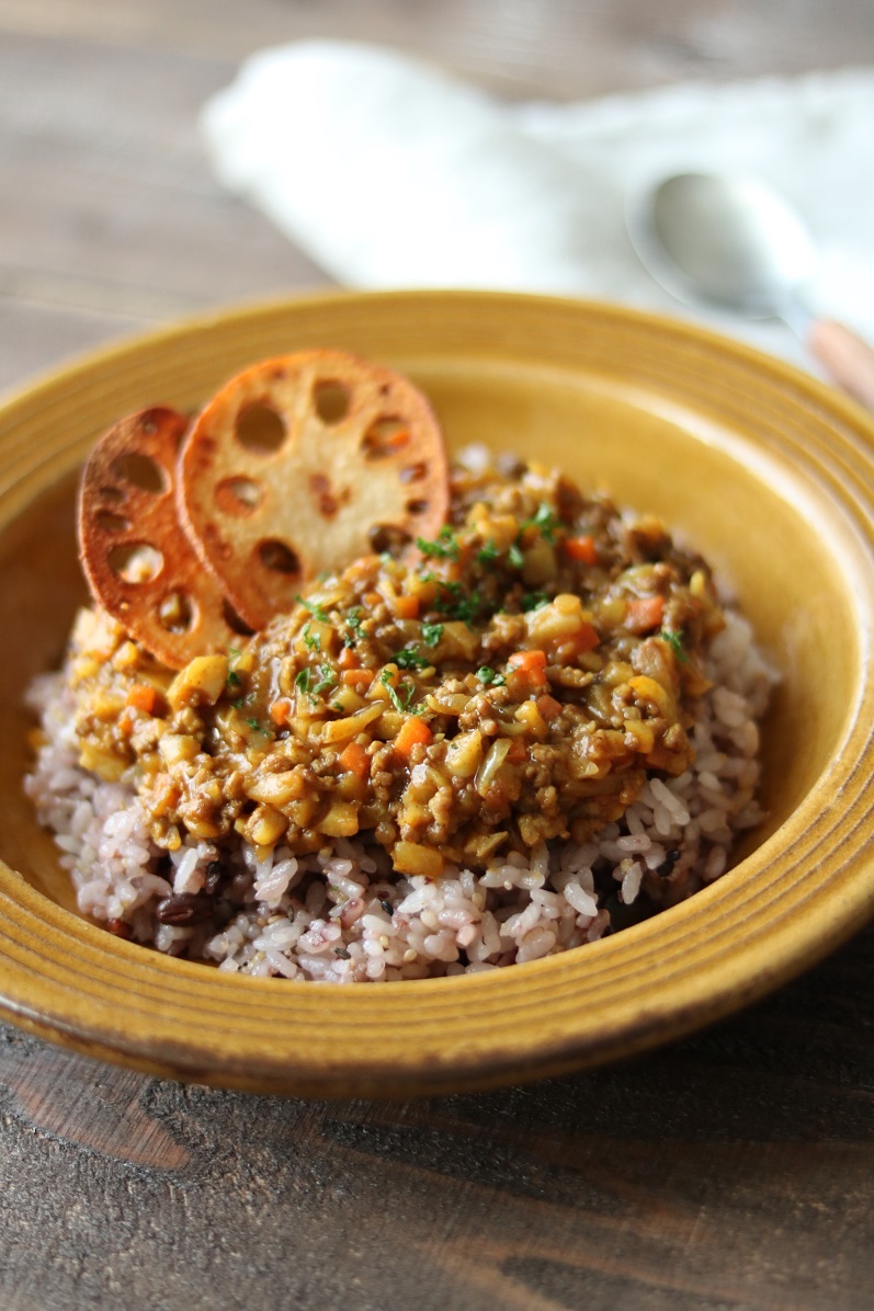 お肉の量増しに「レンコン」を加えた、食物繊維たっぷりのキーマカレー。噛む回数も増えて満腹度もアップ♪