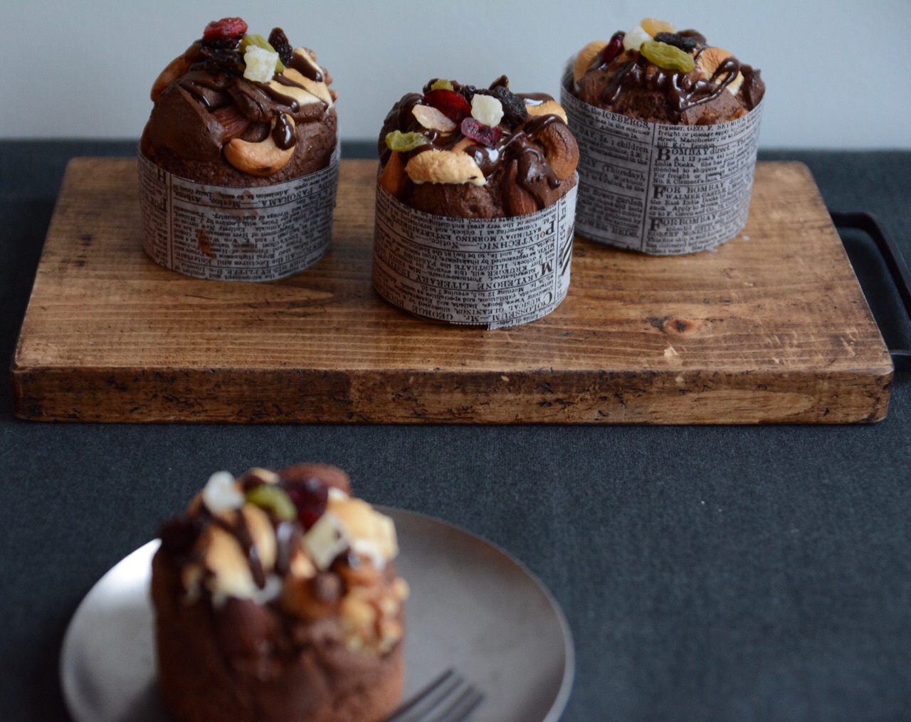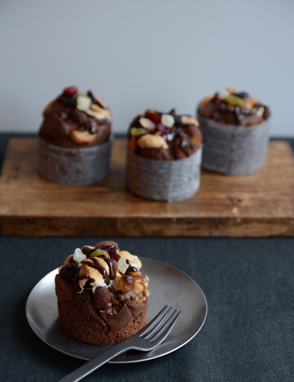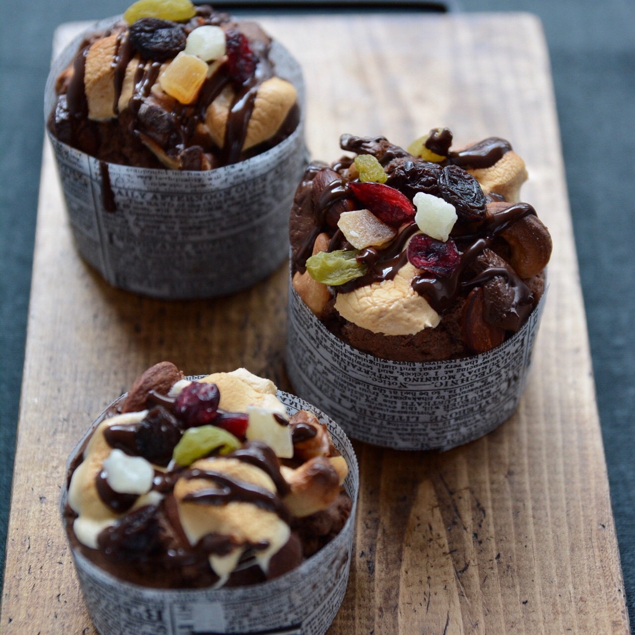 チョコマフィンにナッツやマシュマロ、ドライフルーツを加えたざくざくした食感を楽しめるマフィンにしました!