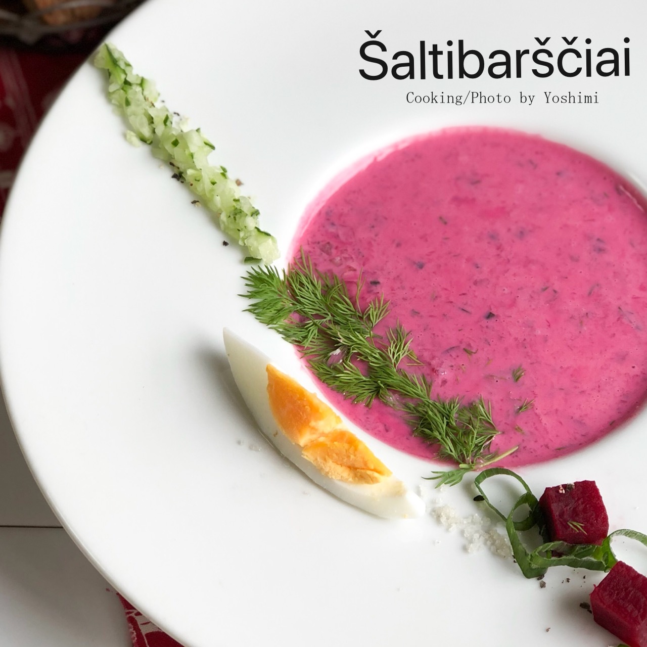- 1,ざっとミキサーにかけたビーツ水煮、きゅうりみじん切り、ゆで卵みじん切り、ディルみじん切り、レモン汁、塩、こしょうを混ぜ合わせる。
