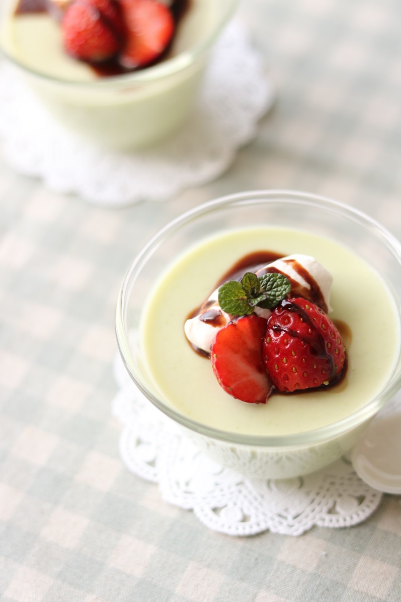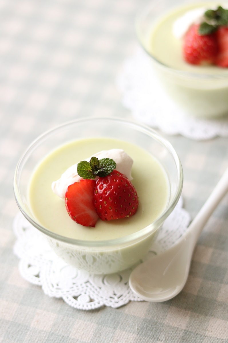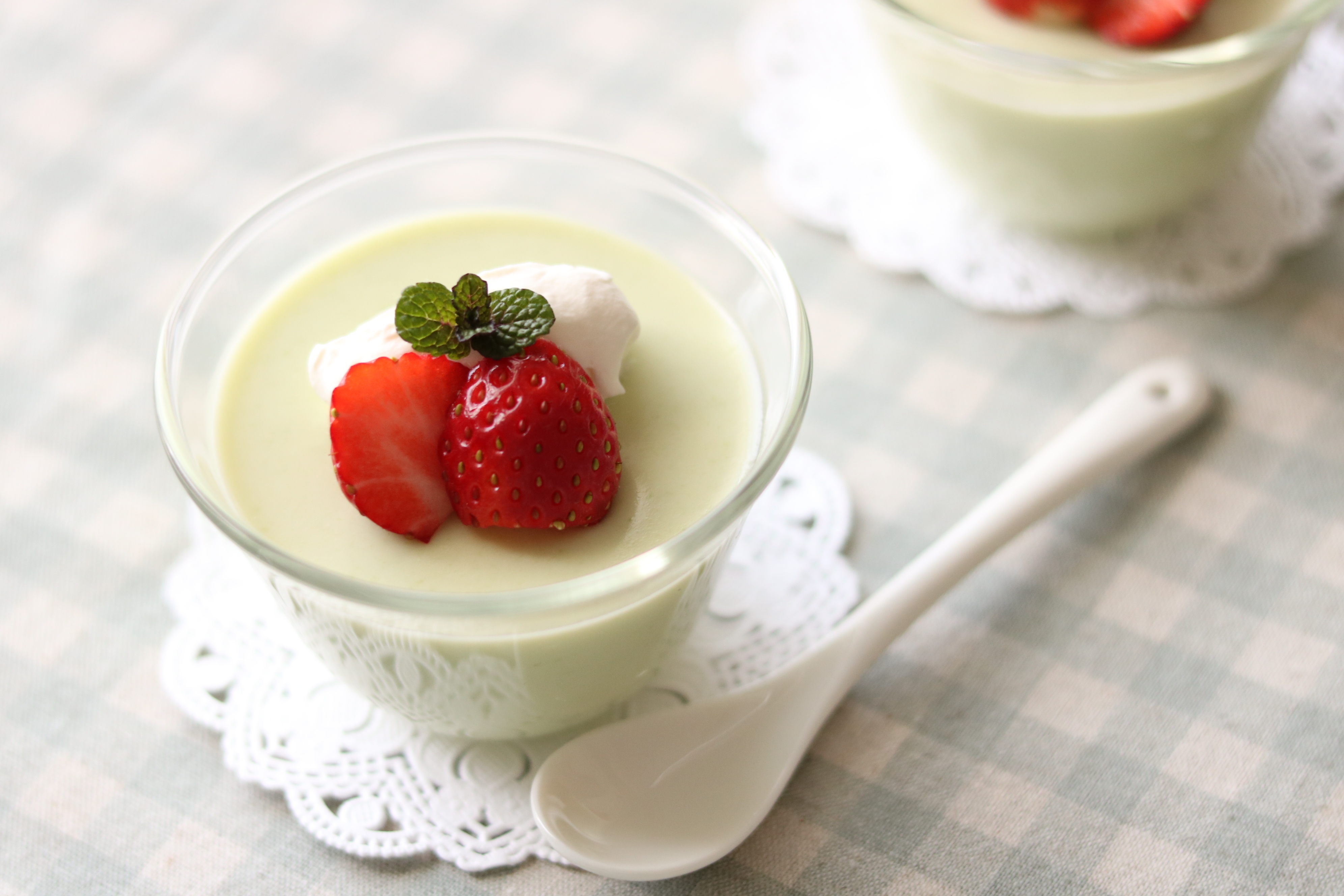 生クリームの半量をアボカドで置きかえた、グリーン鮮やかなパンナコッタ。冷やし固めるだけで簡単なスイーツです。季節のフルーツを添えて♪