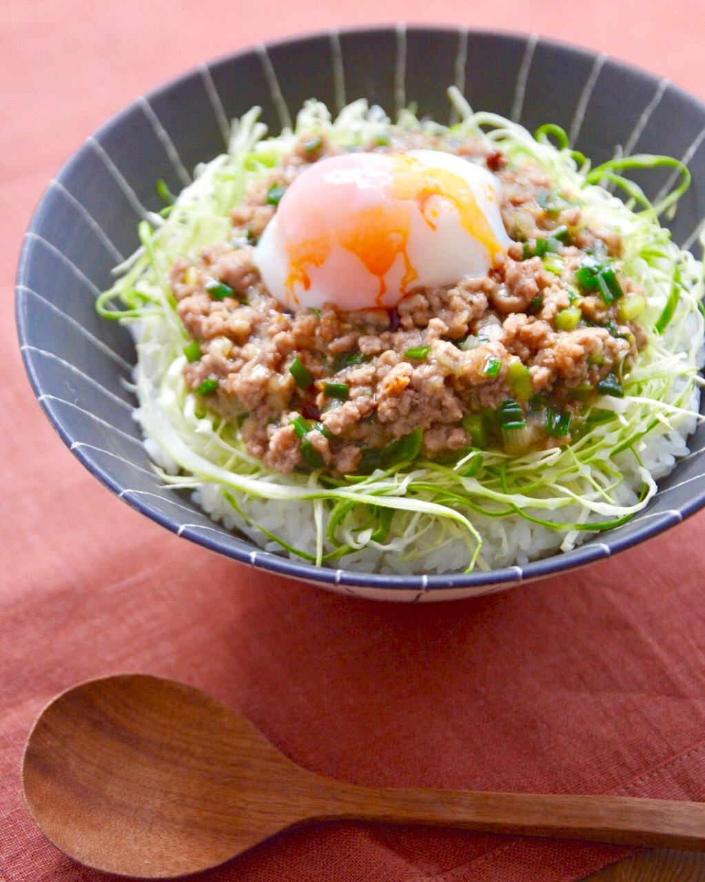 炒めるだけで簡単!皮を使わない餃子風のどんぶりに仕上げた一品です。
