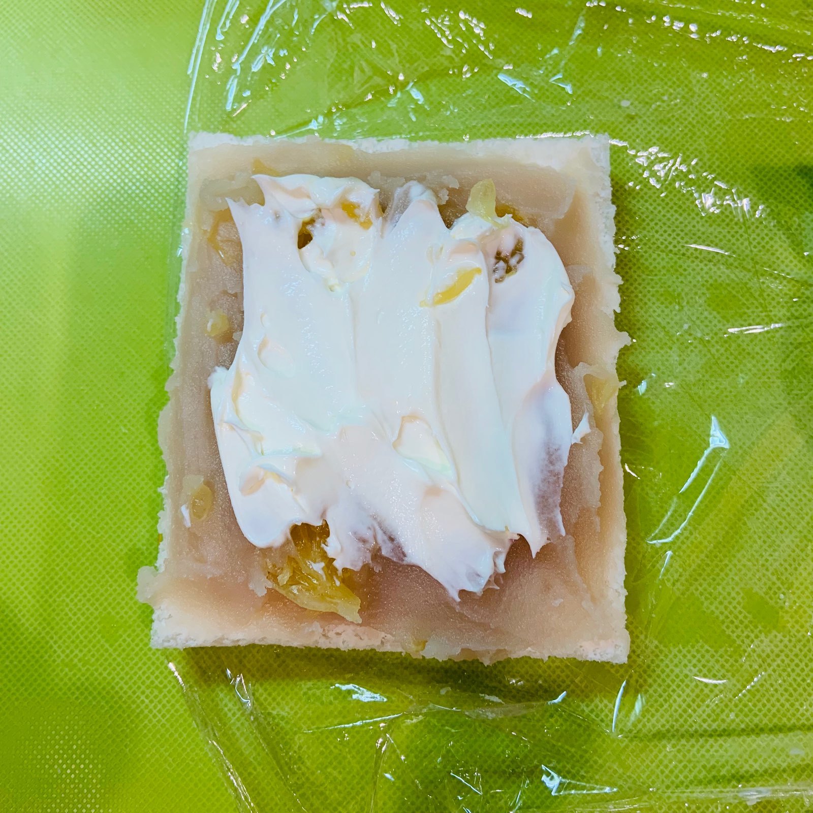 ラップに食パンを乗せ、片面に薄くサワークリームを延ばして塗り、白あん、残りのサワクリームの順番に乗せる