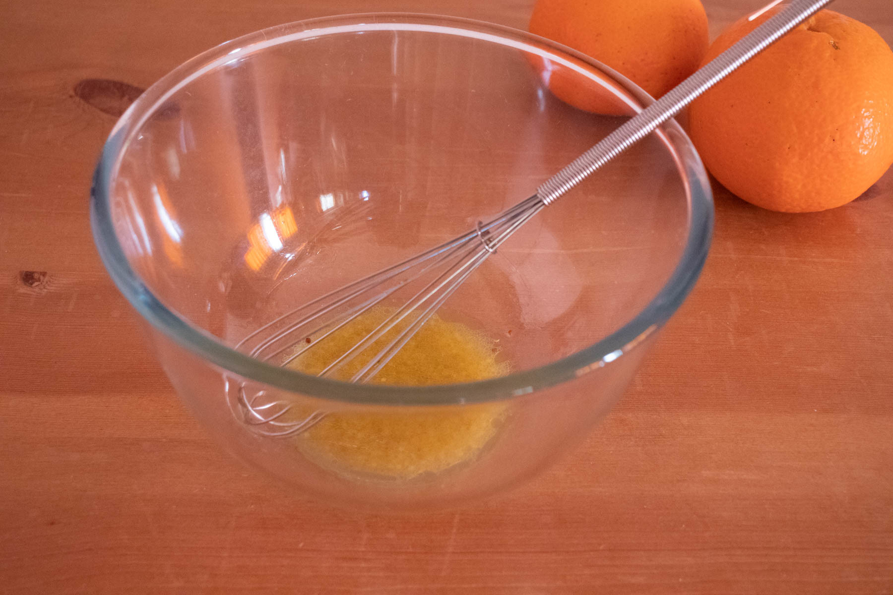 Bのオレンジジュース・酢・マスタード・メープルシロップ・塩を合わせホイッパーで混ぜる。