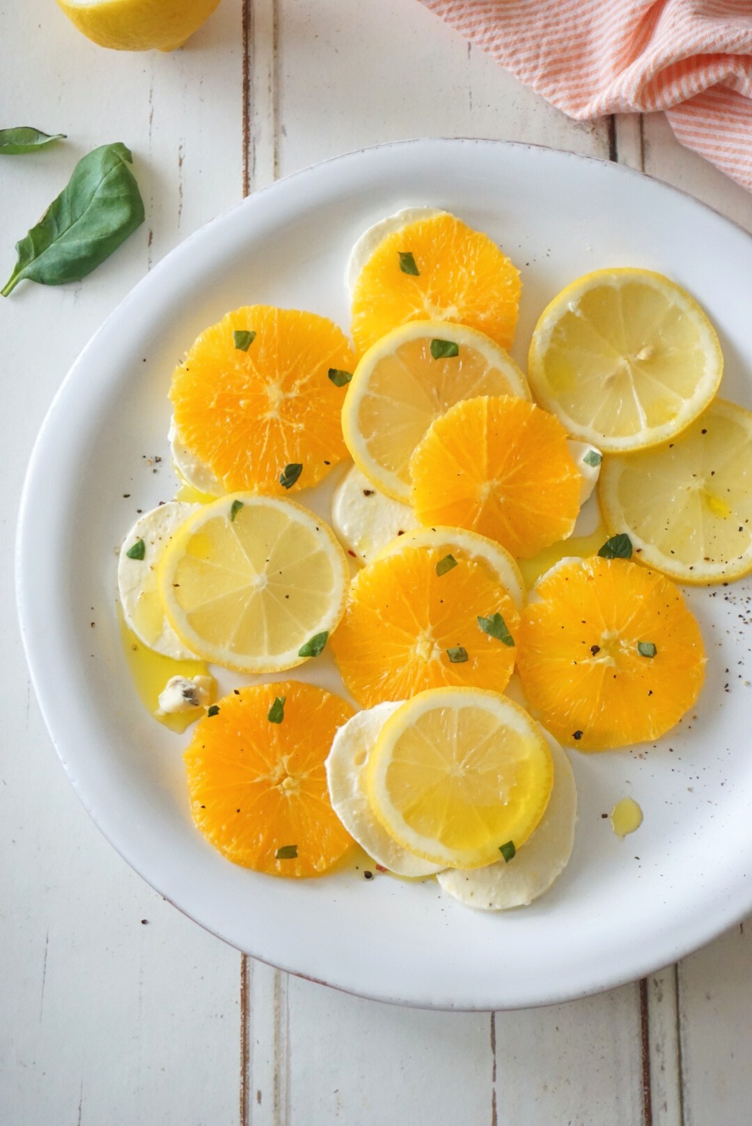 - お皿にモッツァレラチーズをのせたらオレンジ、レモン、ブルーチーズを盛りつける