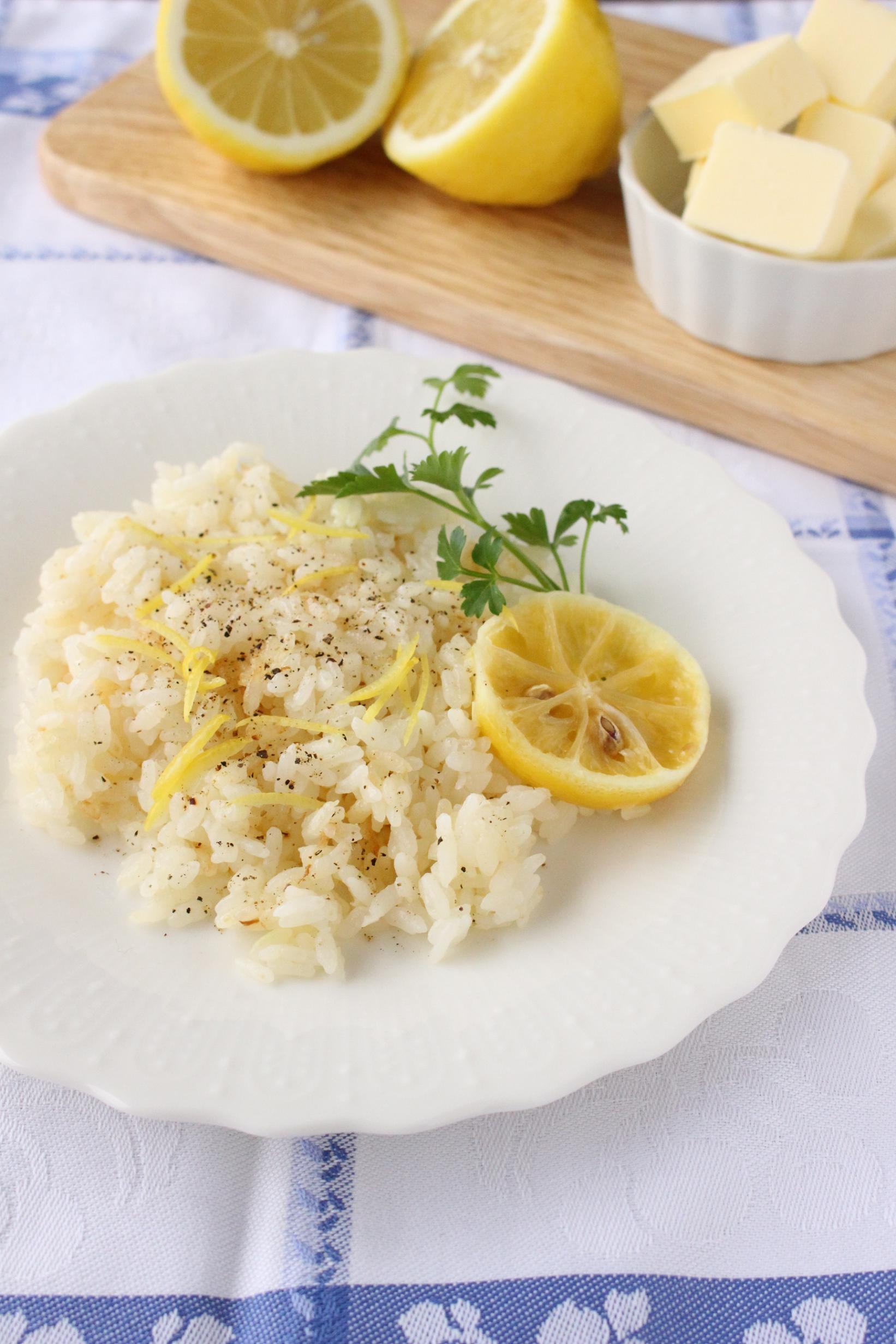 レモンの香りが爽やかなバターライス。炊飯器で簡単に作れます。レモンを一緒に炊き込むことでほのかな香りが移り、爽やかなバターライスに仕上がります。ブラックペッパーのアクセントがよく合います。(炊飯する時間は除く)