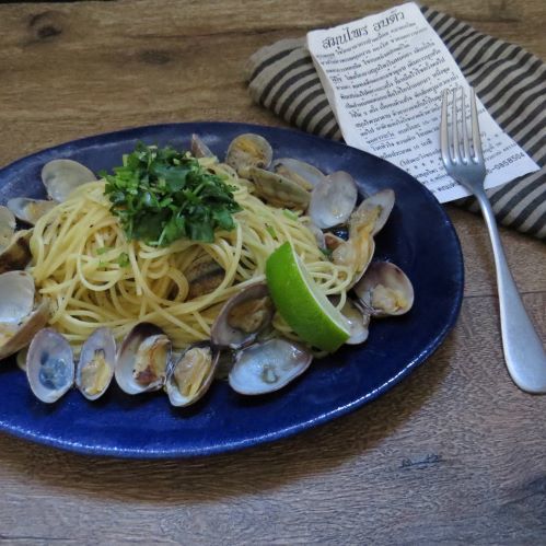 ナンプラーとパクチーを使った、アジア風ボンゴレ。ライムを絞りかけると、さらにエスニックな味わい。