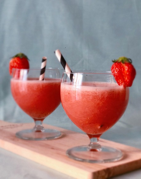 - ミキサーにすべての材料を入れ、滑らかになるまで攪拌する。グラスに注ぎ、お好みでいちごをトッピングする。