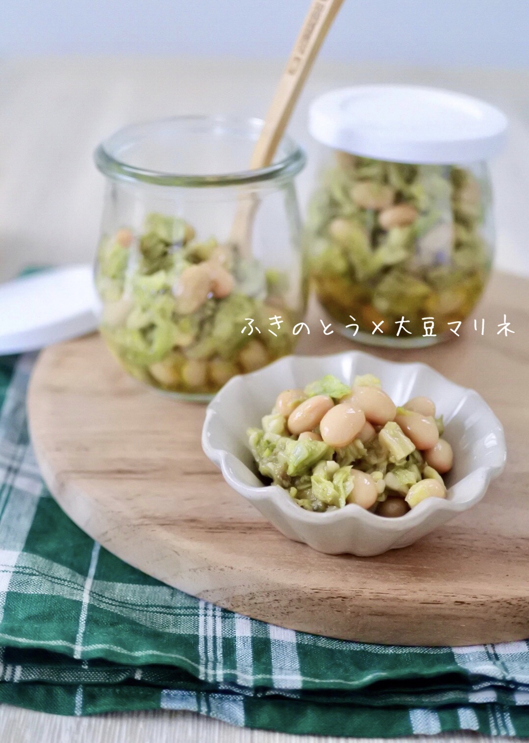 春の季節限定ふきのとうを苦味を抑えてマリネ液に漬けました。大豆と合わせて常備菜に。