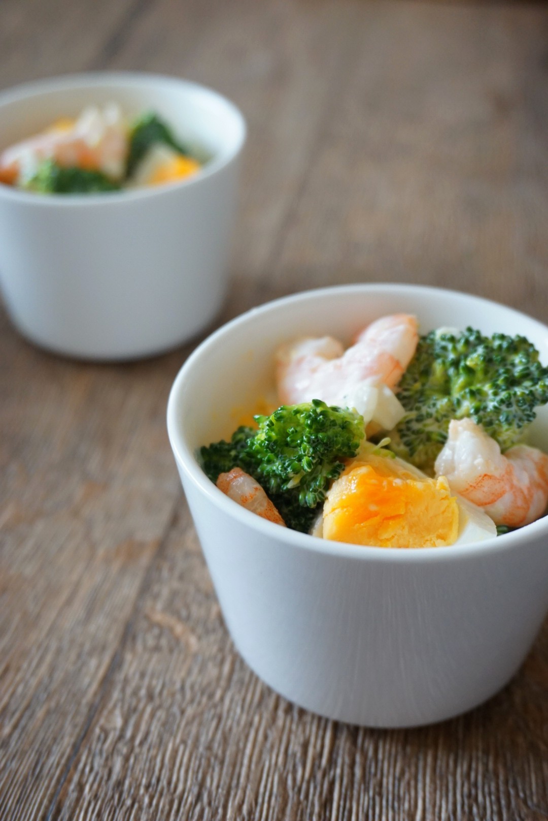 - 【下準備】ブロッコリーは小房に分け熱湯で1分ほど茹でたらザルにとり水気をきる。卵は好みの固さに茹で一口大に切り、新玉ねぎはみじん切りにする(新玉ねぎでない場合は水にさらして辛味をぬき、キッチンペーパーで水気をとる)