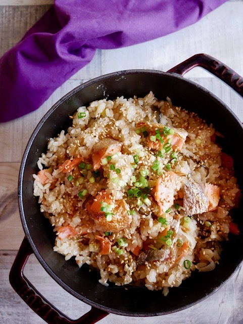 - 炊き上がったら、バターと鮭をごはんに混ぜ、ごまと万能ねぎを散らす。