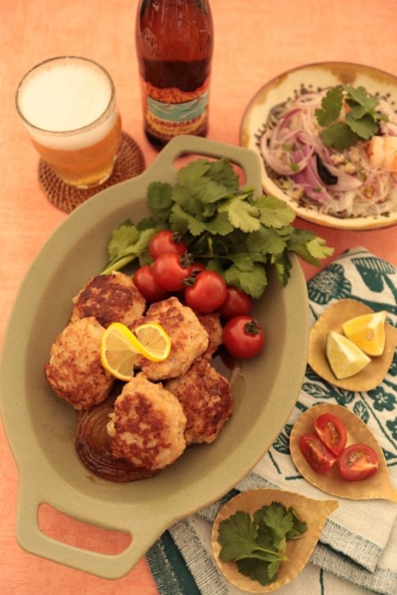 - 玉ねぎ1/4個をすりおろし、玉ねぎ1/4個とパクチー1/2束をみじん切りにし、ボウルに鶏ひき肉とBとともに入れ、よく練り混ぜ6等分に丸める。