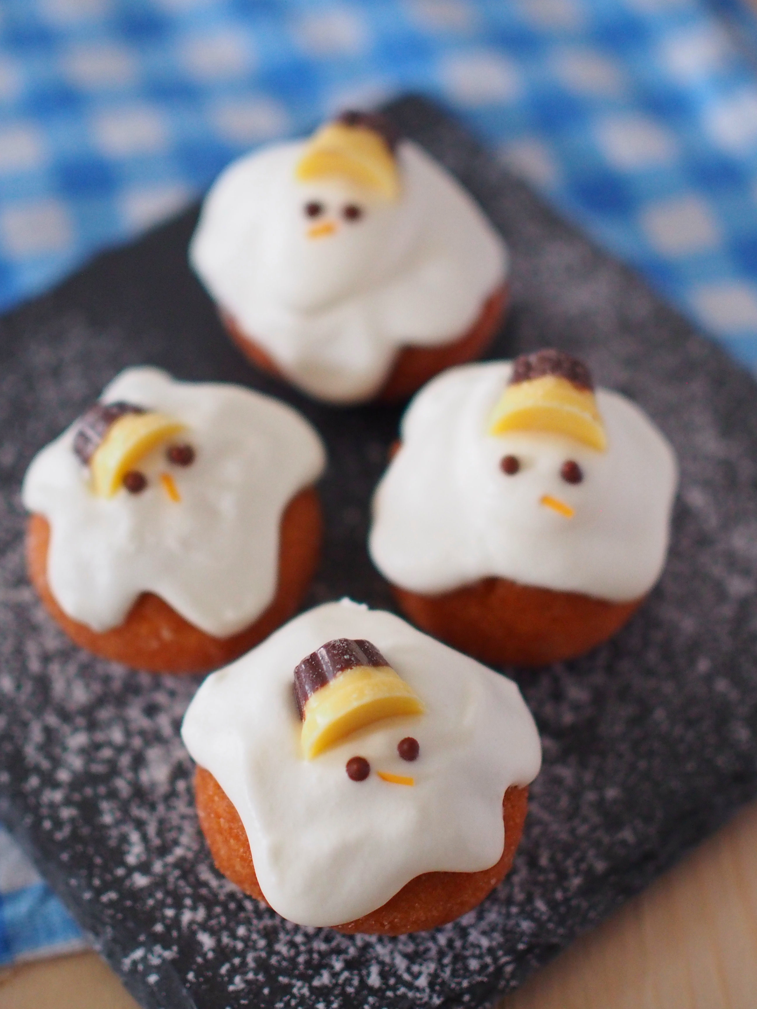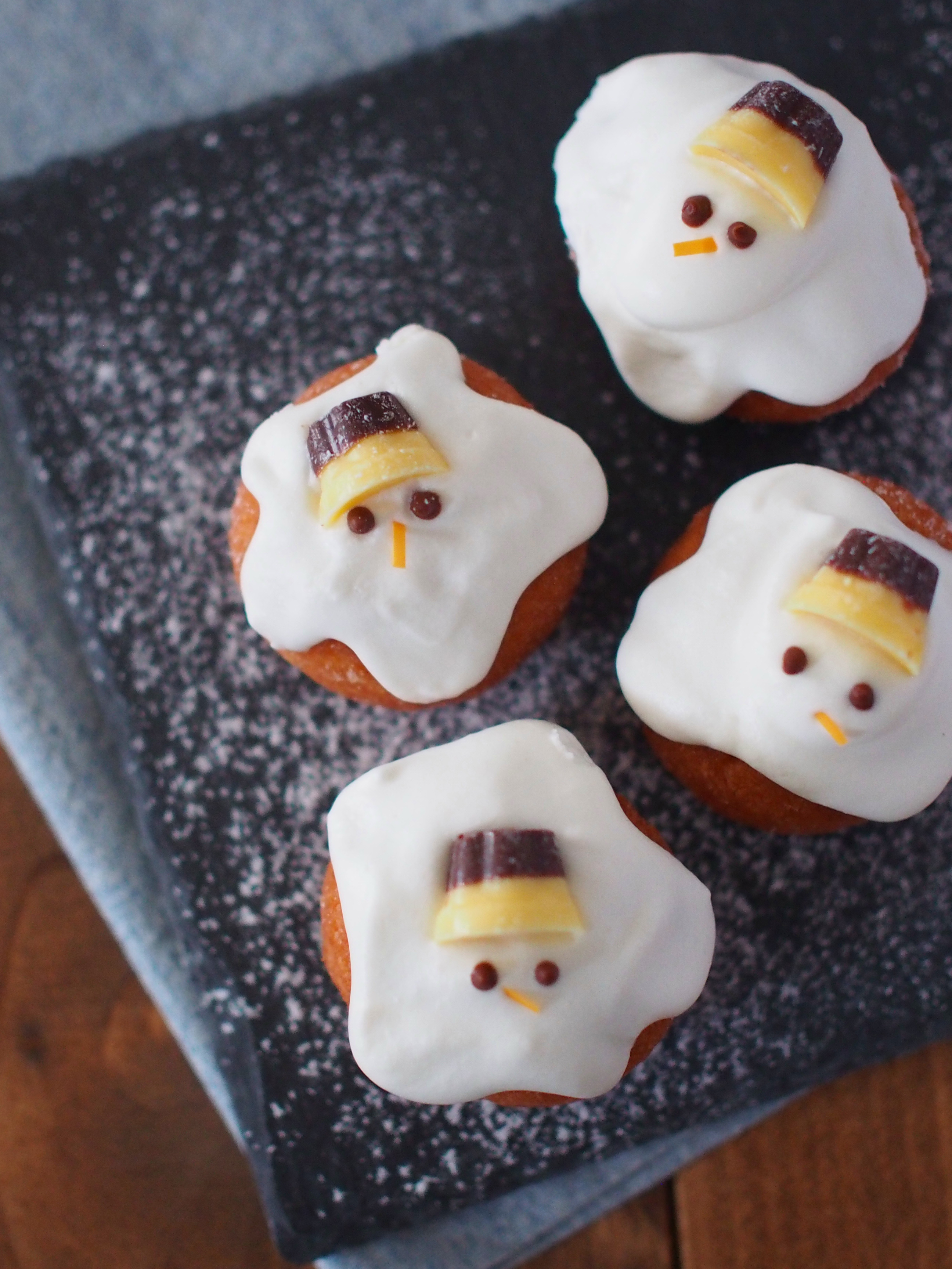 - 1のチョコレートで目を描き、鼻、帽子のパーツを飾る。