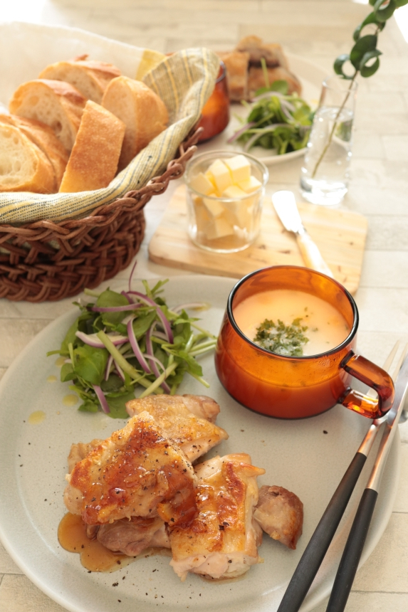 - フライパンを中火で熱し、とり肉を皮を下にして入れる。上から押しつけるように焼き、出てきた脂をキッチンペーパー等で拭き取りながら、皮に焼き色が付き、パリパリになるまで5分程焼く。裏返して、中に火が通るまで2分程焼き取り出す。