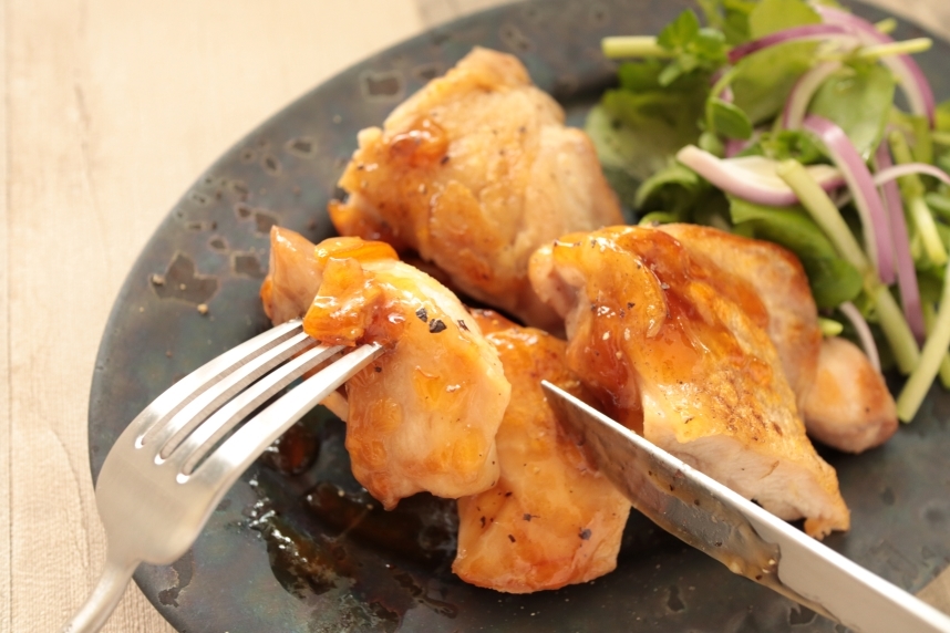 - とり肉は余分な脂肪を取り除いて筋を切り、厚さを均一にし、塩こしょうをふり下味をつける。