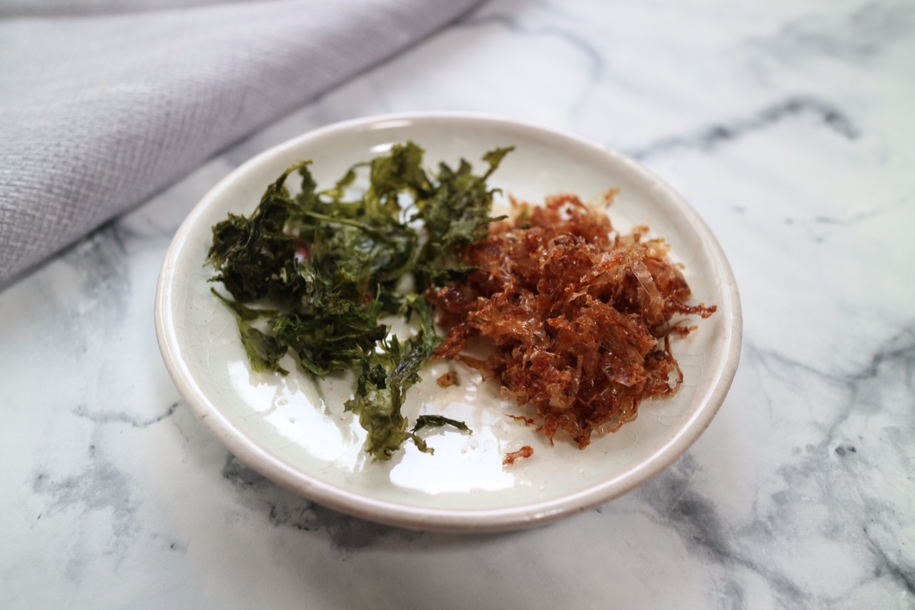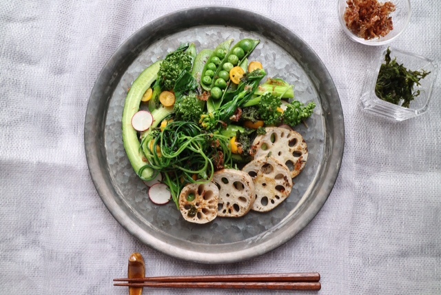 - お皿に2の野菜を盛り、1と海苔をふりかける。