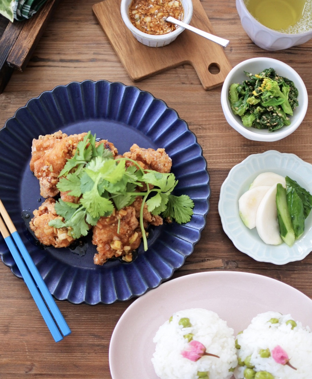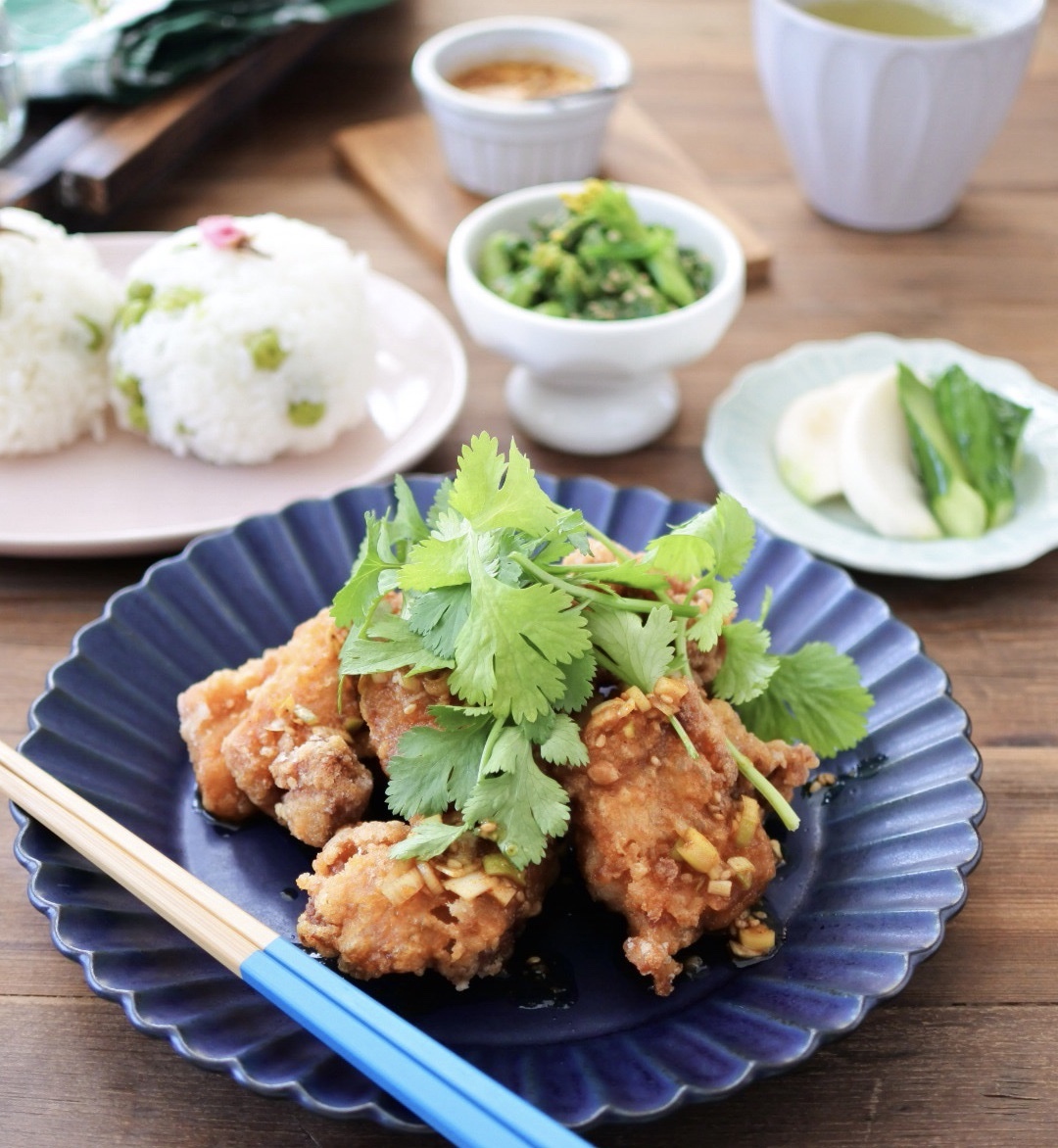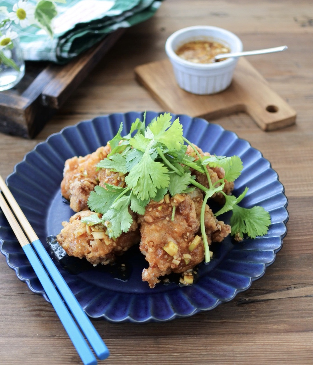 人気の油淋鶏をピリ辛に仕上げました。揚げたてカリカリにねぎだれをかけて。パクチーと一緒に食べると、香りよくたくさん食べられます。