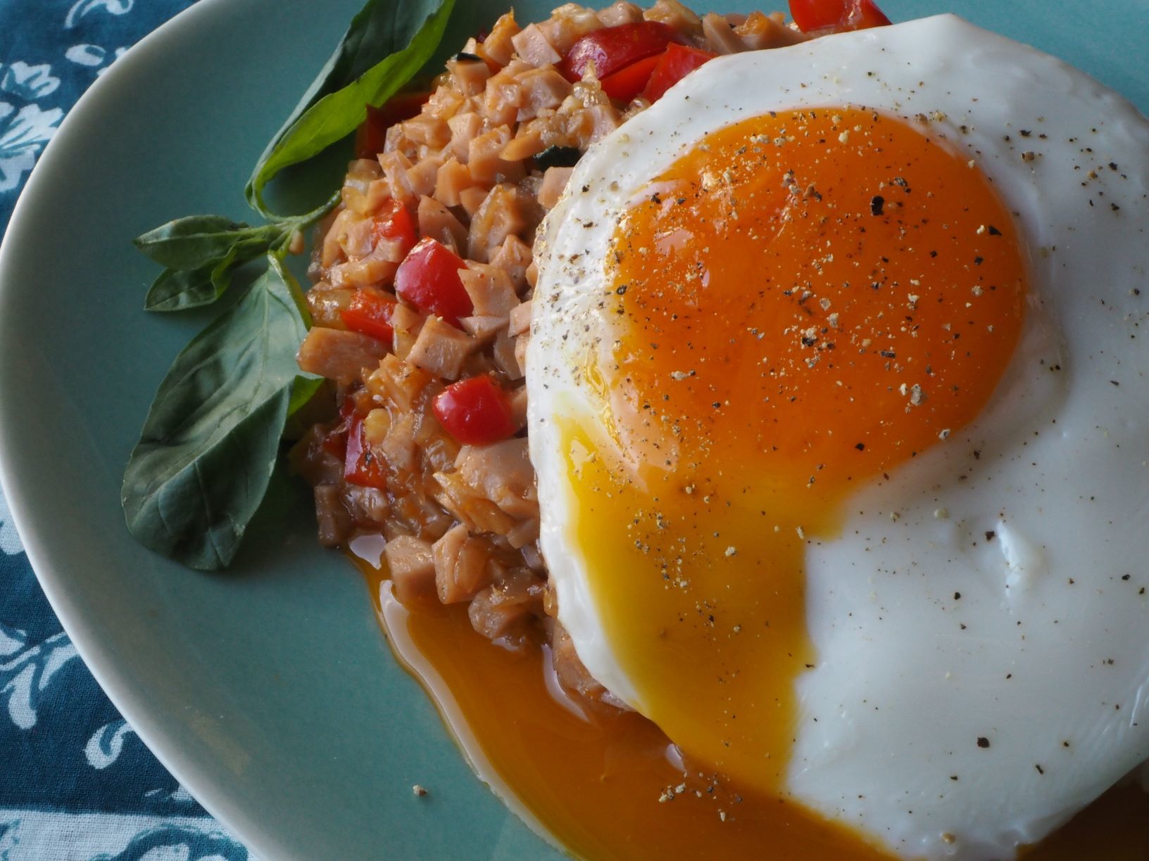 - 器にごはん(分量外)を盛り、④をのせる。フライパンで目玉焼きを作り、コショウをふって添える。
