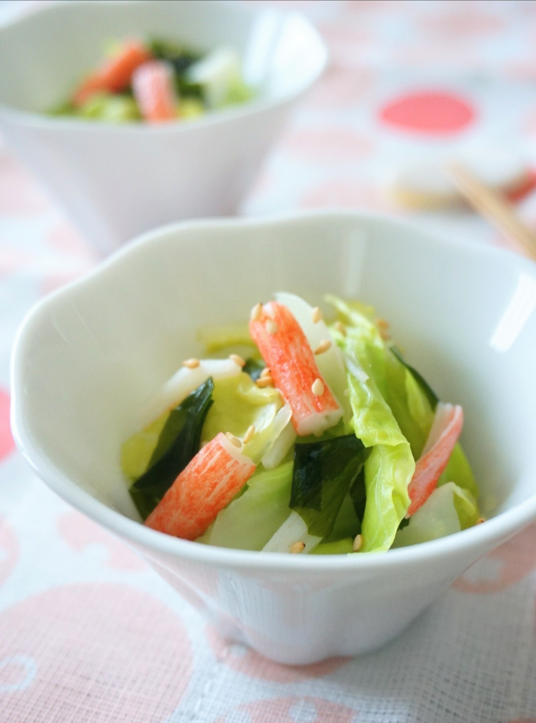 - ボールに春キャベツ、わかめを入れ、カニかまは手でさきながら加える。レモン汁、醤油を加えたらさっと混ぜ合わせる