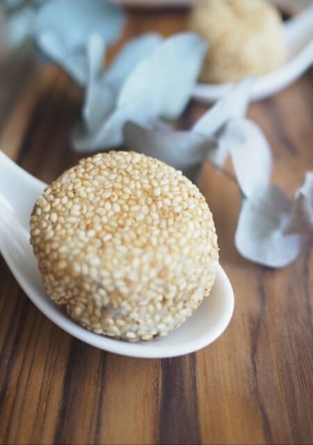 本来は生地にラードを練りこんで作る胡麻団子ですが、豆腐を使ってももちもちになるんです。レシピの分量では10個作れます。