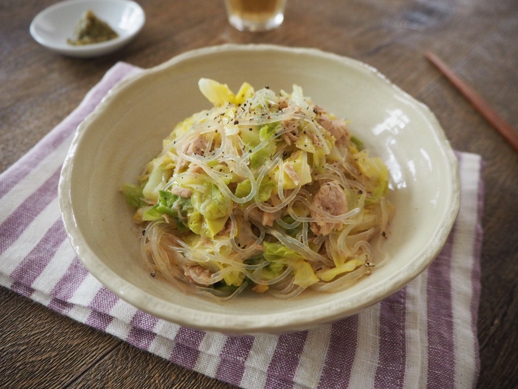 きゃべつをさっと炒め、A、春雨、ツナ水煮缶を入れて