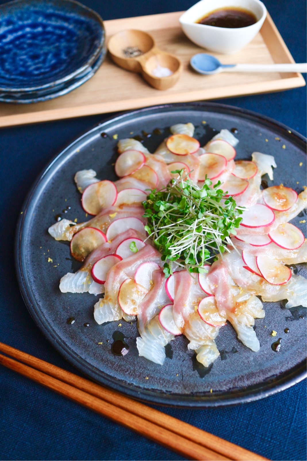 - 真鯛と真鯛の間に薄切りにしたラディッシュを挟み、交互に器に盛り付け、ブロッコリーの新芽とレモンの皮を散らし、混ぜ合わせおいたAをかけていただく。