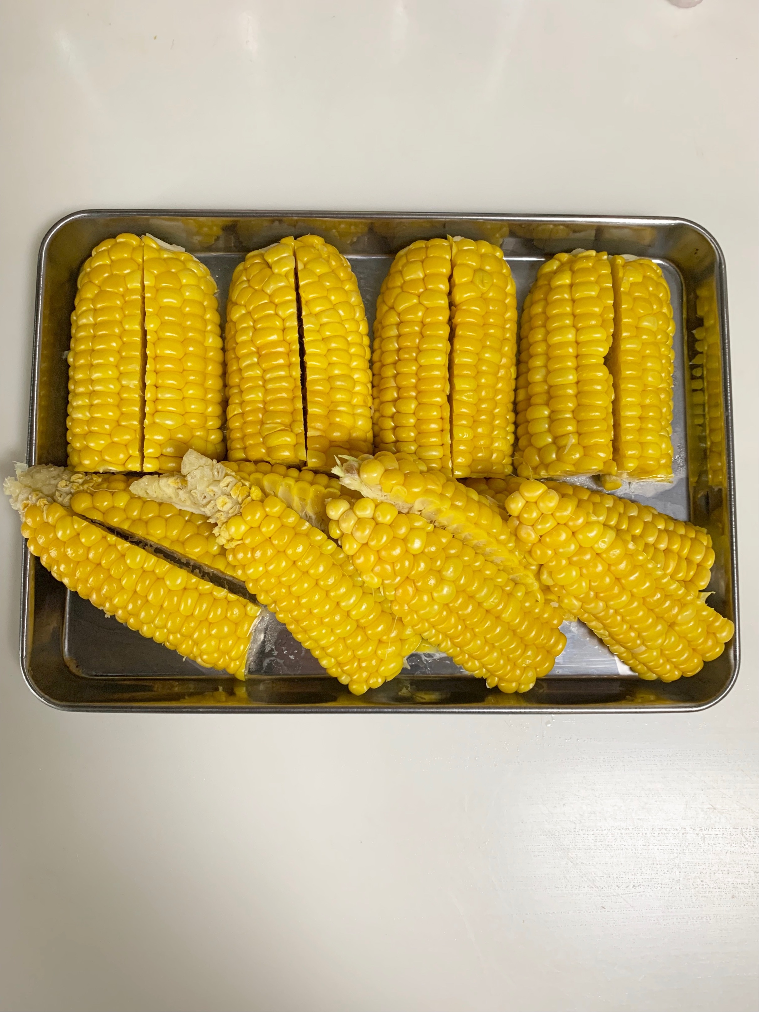 とうもろこしの皮とヒゲを取り水洗いをし、濡れたままラップで包み600wの電子レンジで5分加熱しておく。