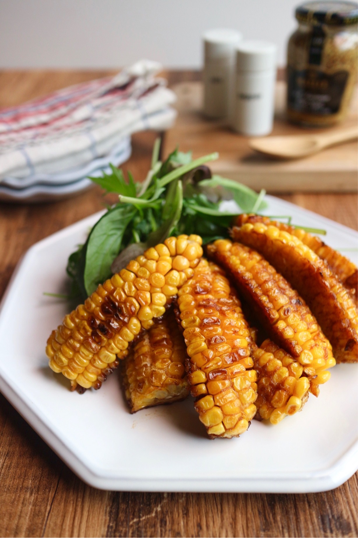 片栗粉を全体にまぶし、中火でカリッと揚げ焼きすることによってとうもろこしの身が崩れにくくなります。また、焼きあがったらすぐにタレをつけると染み込みが良くなります。