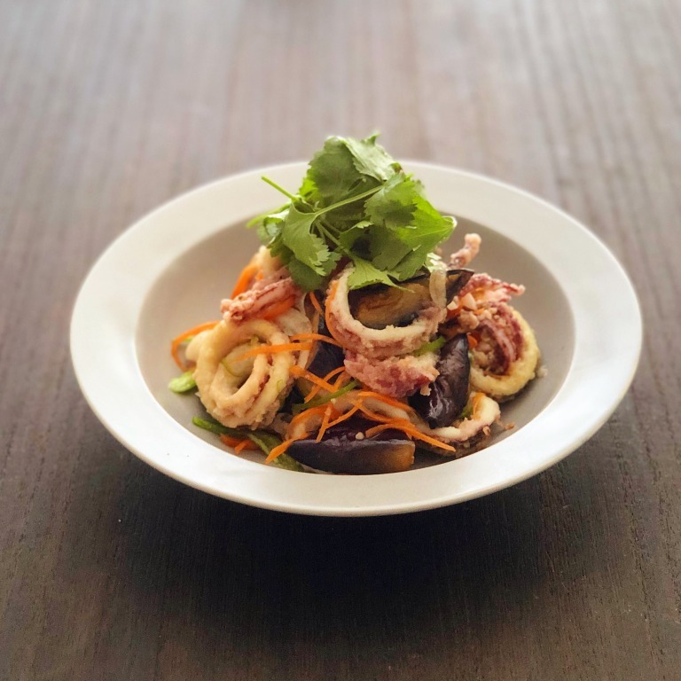 - 容器に揚げた茄子、イカと、細切りにした玉ねぎ、人参、ピーマンを入れ、調味料Aをかけて置く。5分程したら全体を混ぜ、更に10分置く。