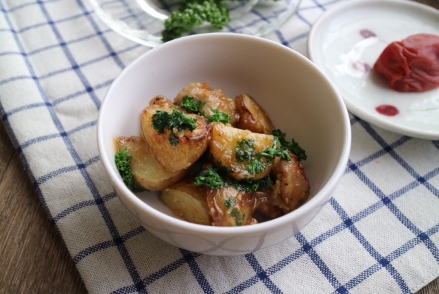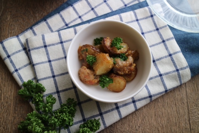 - フライパンに油を入れて中火で熱し1を入れ、表面に焼き色が付いたらAを入れる。全体に絡まったら火を止め、小さくちぎったパセリを入れて軽く混ぜ、お皿に盛る。