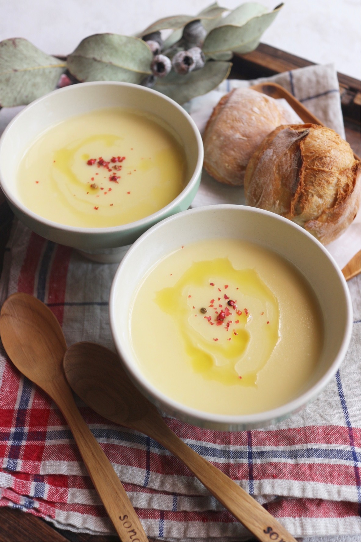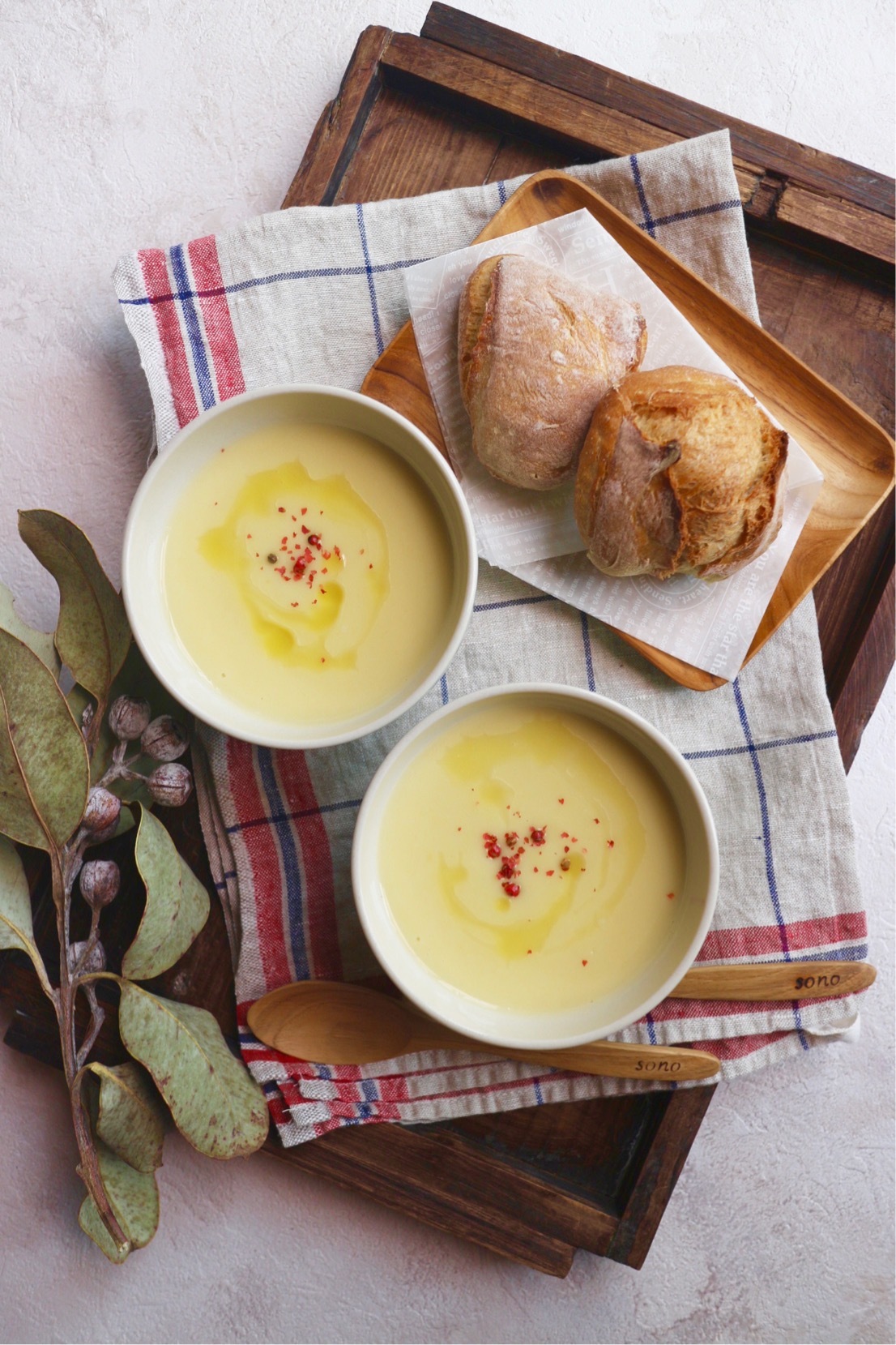 素材の旨味を存分に味わえるヘルシーポタージュです。シンプルだからこそ、じっくりと煮込むことによって素材本来の甘みや旨味が引き出されます。今回、ハンドブレンダーを使っていますが、ハンドブレンダーがない方はミキサーを使ってでもOK。暑い日は冷やして食べても美味しいですよ。