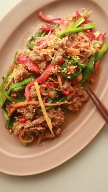 牛肉の切り落としを炒める時は、なるべく漬けていたタレを落としてから焼く。