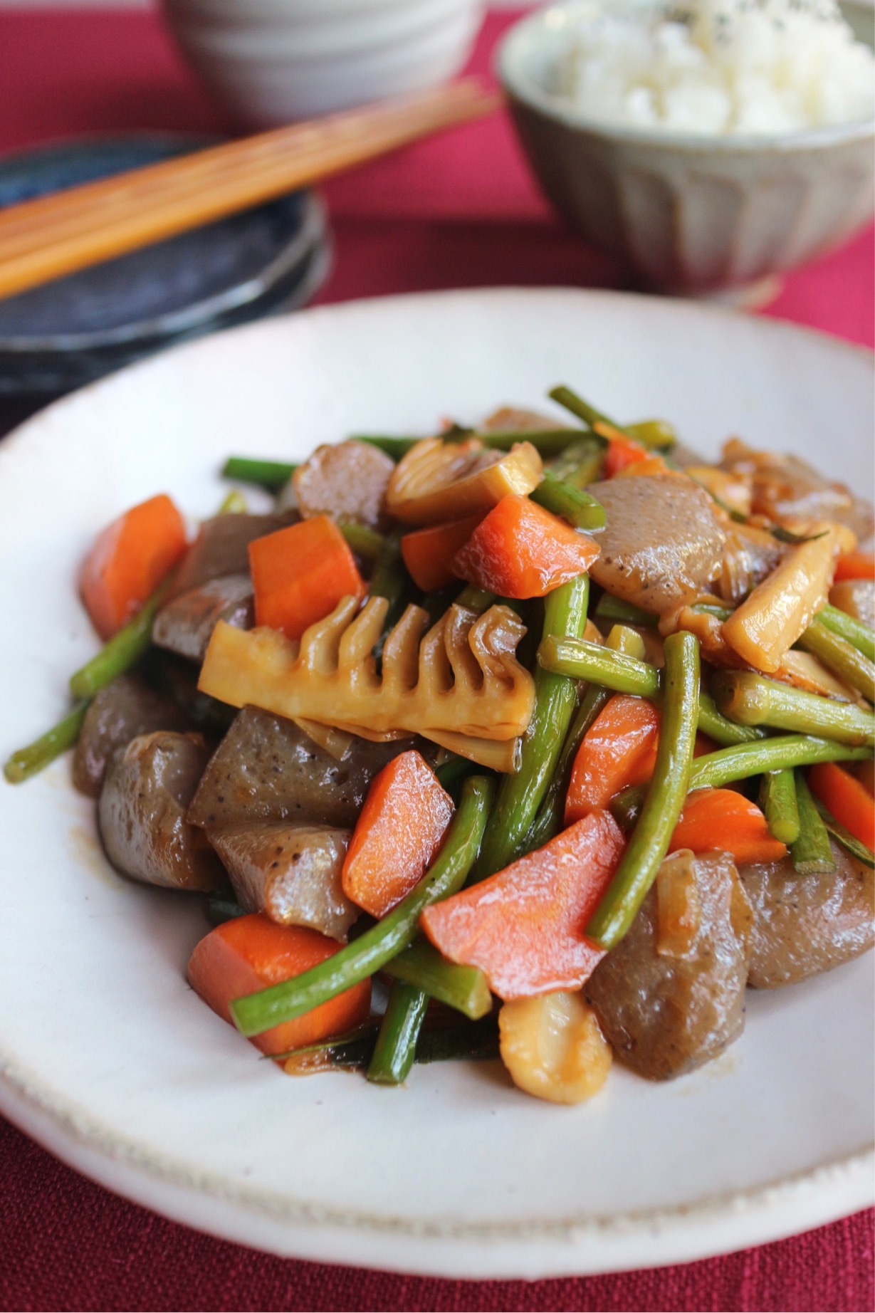 ご飯が進む!!ニンニクの芽と筍のシャキシャキとした食感や弾力のあるこんにゃく、ちくわなど、色々な食感を楽しめる野菜たっぷりでヘルシーなレシピです。最後にごま油で香り付け。甘辛い味付けまでご飯が止まらない一品です。