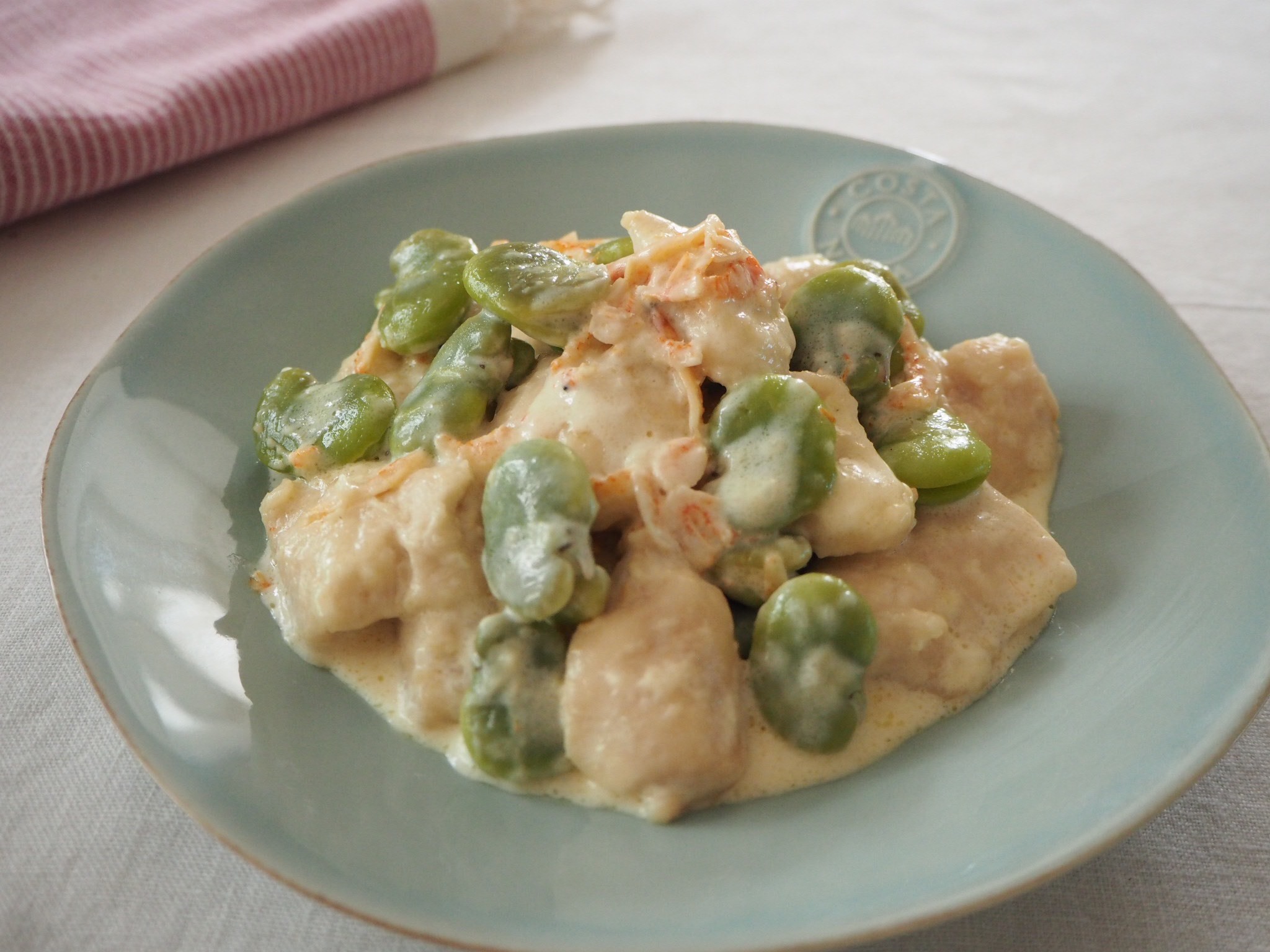 - さらに空豆をいれ、塩、こしょうで味を整えて