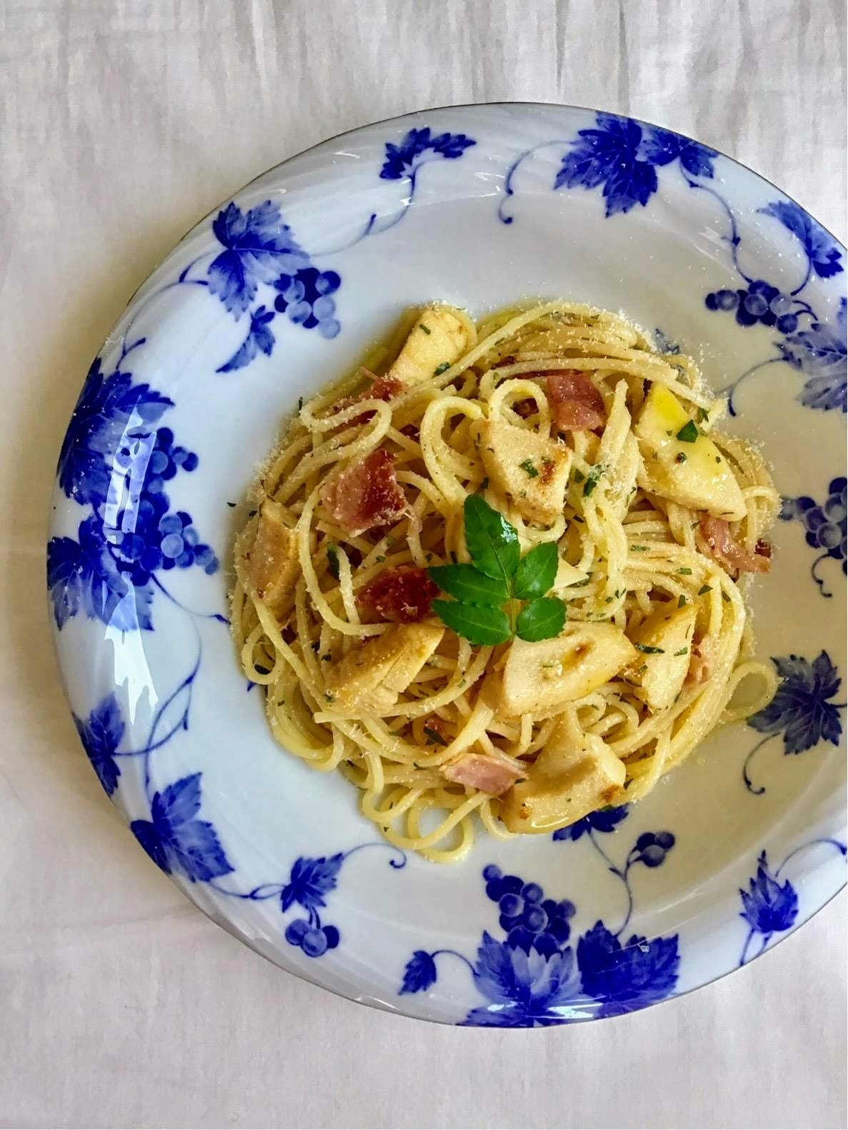 工程03に茹でたスパゲッティとゆで汁大さじ1程度を加えまぜ合わせ、胡椒、醤油を加える。 火を止めてから木の芽を加え器に盛り、パルメジャーノレッジャーノ、オリーブオイル(大さじ1)を加え、木の芽の葉を添える。