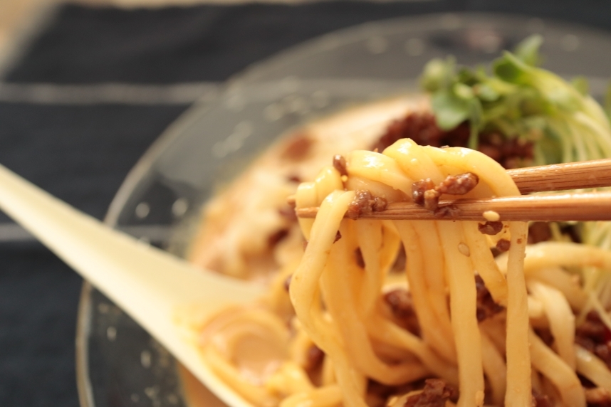 - フライパンにゴマ油(大さじ1)・甜麺醤(大さじ2)・鶏がらスープを入れ弱火にかけ、ヘラ等で絶えず混ぜながら鶏がらスープの粒が見えなくなるまで熱する。ボウルに移し豆乳・白すり胡麻を加え、泡立て器でよく混ぜ冷蔵庫に入れる。