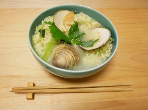 - はまぐりの口が開いたらはまぐりを取り出し、沸騰したらインスタントラーメン、酒、塩を入れて3分煮る