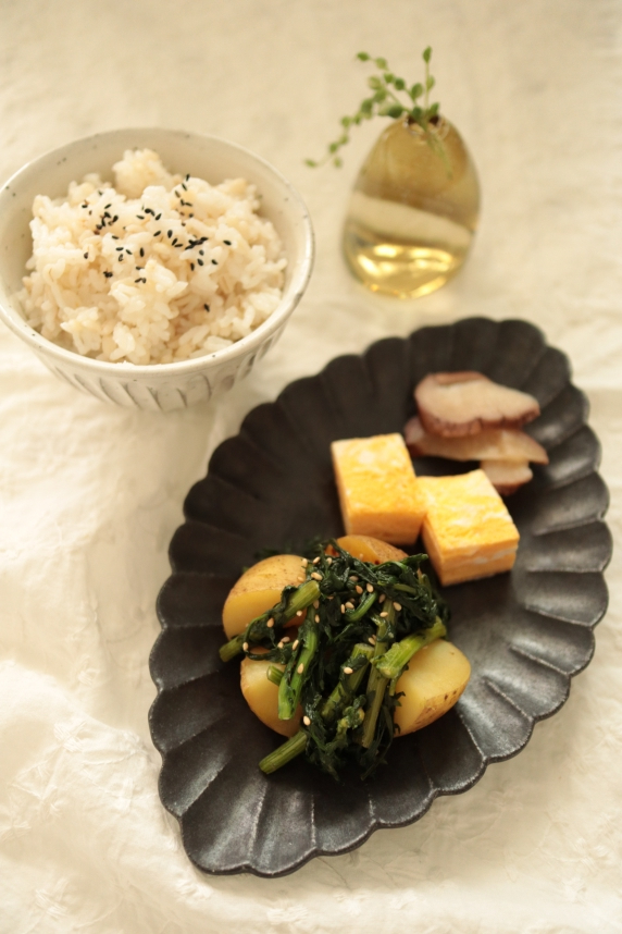 - 鍋に新じゃが・水・ゴマ油を入れ全体を軽く混ぜ、蓋をして弱火にかけ11分蒸し、春菊の茎・葉の順に加え再度蓋をして、新じゃがが柔らかくなり、春菊が少ししんなりするまで3分程蒸す。