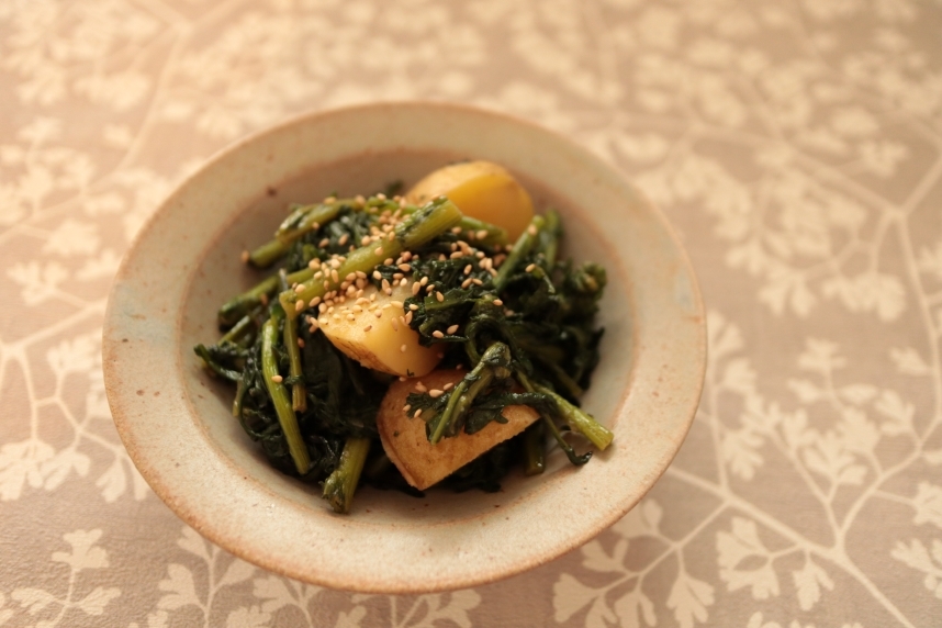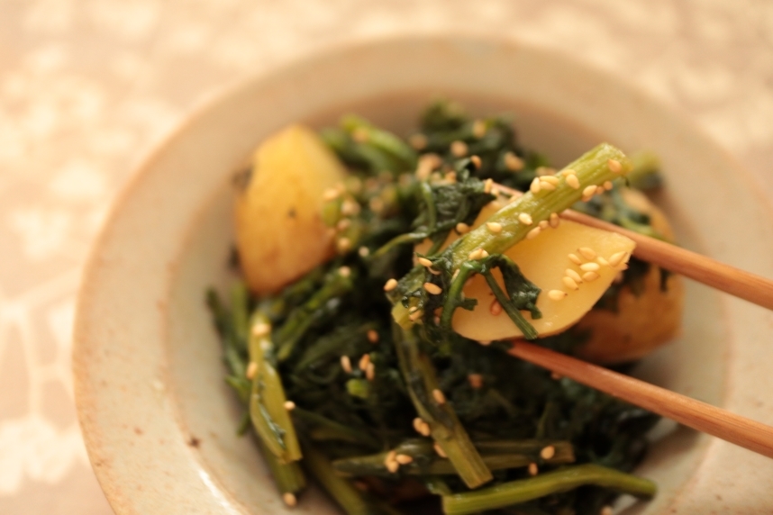お鍋に入れていくだけで出来る簡単な副菜です。味付けはゴマ油と塩だけでシンプルですが、春菊の風味と新じゃがのホクホク感でお箸が進みます。手軽に副菜を作りたいときや朝ごはんにもおすすめです!