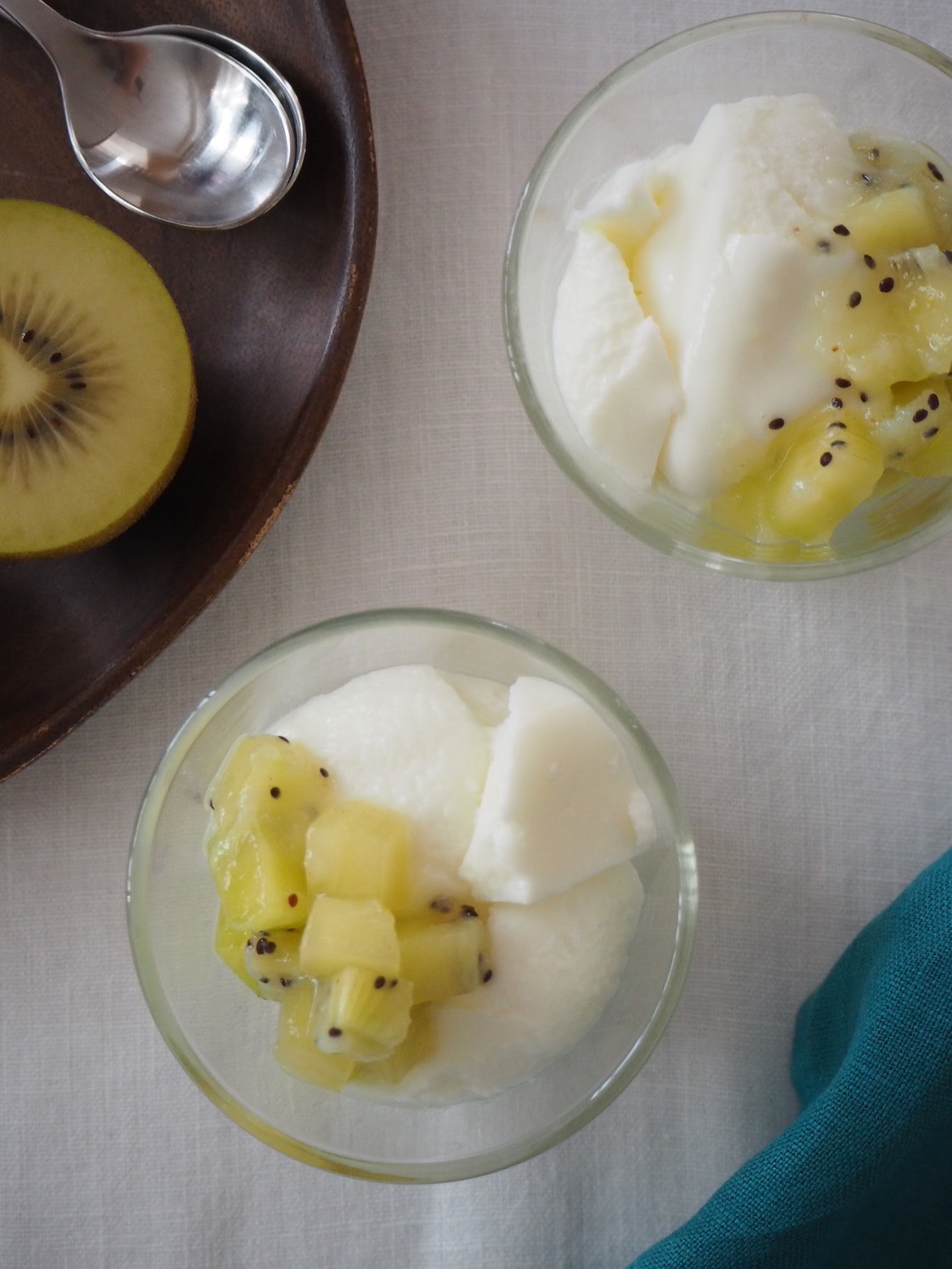 キウイは、皮をむき、半量をすりおろして残りは角切りにする。