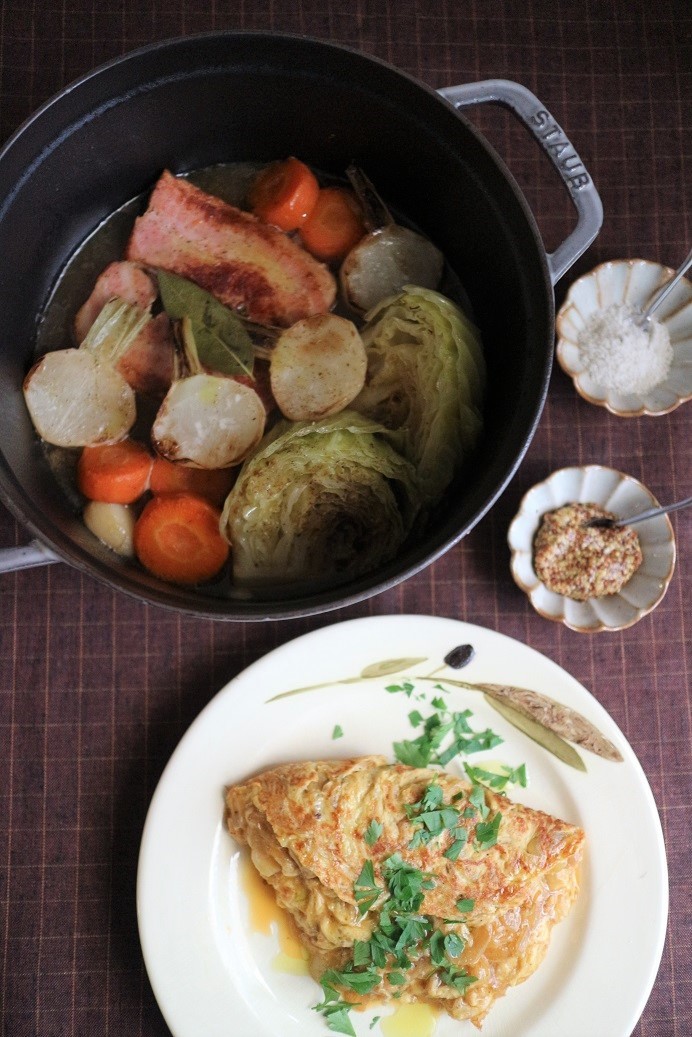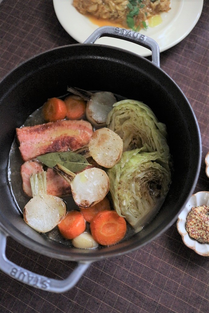 - 鍋にオリーブ油・にんにくを入れて火にかけ香りを出し、キャベツ・かぶ・にんじん・ブロックベーコンを並べて両面に焼き色をつけ、塩・こしょうをして白ワイン・ローリエを加えて沸かし蓋をして弱火で15分位蒸し煮にする。