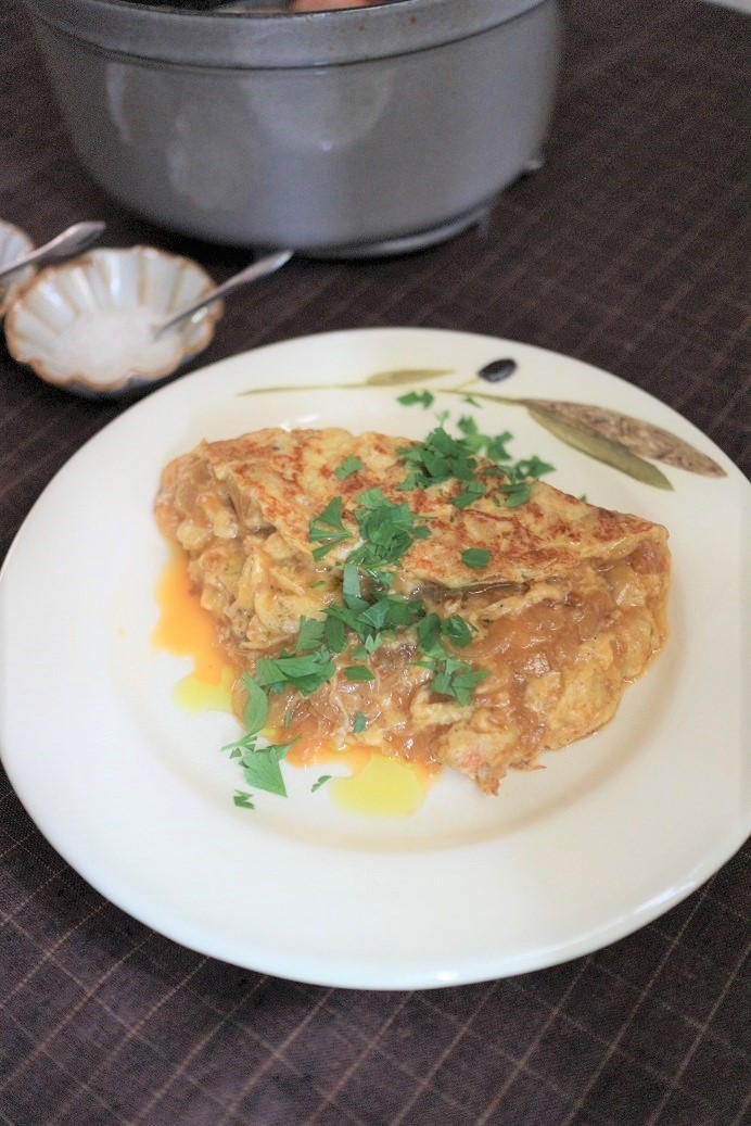 - ボウルに卵を溶きほぐし1の玉ねぎ・パルメザンチーズ・塩・こしょうを加えて混ぜ、フライパンにオリーブ油(大さじ1)を入れて熱し、卵液を流し入れ全体を大きく混ぜ半熟状になったら半分に折って器に盛りこしょう・イタリアンパセリをふる。