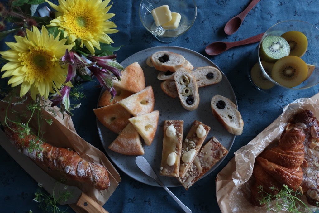 パンをスタイリングしました。 ネイビーのクロスを使ってかっこよさを演出しました。 花や果物でさわやかさも出しました。