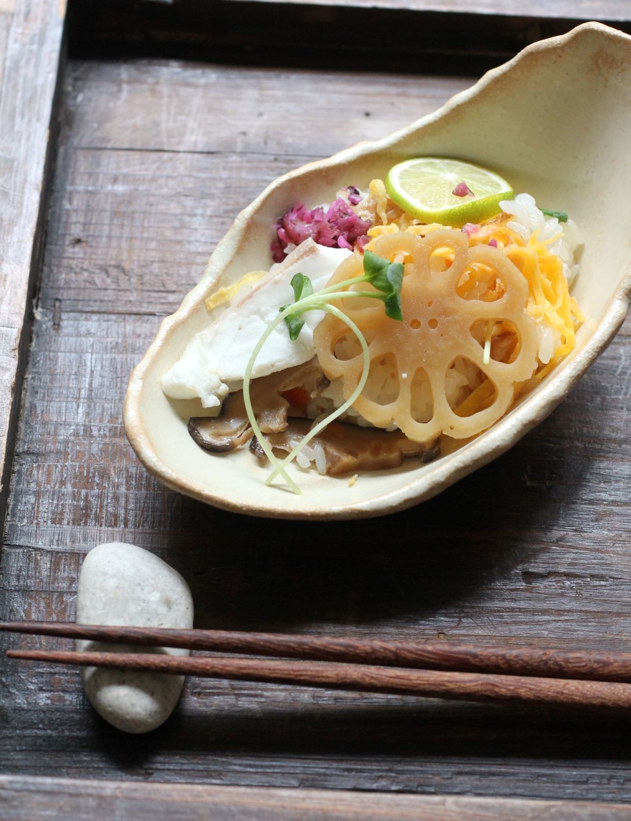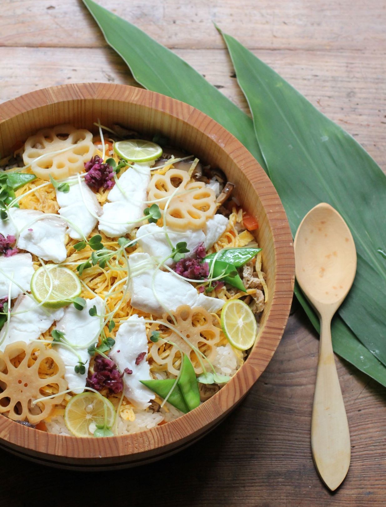 4⃣の上に錦糸卵をちらし、鯛、れんこん、絹さや、柴漬けを飾る。