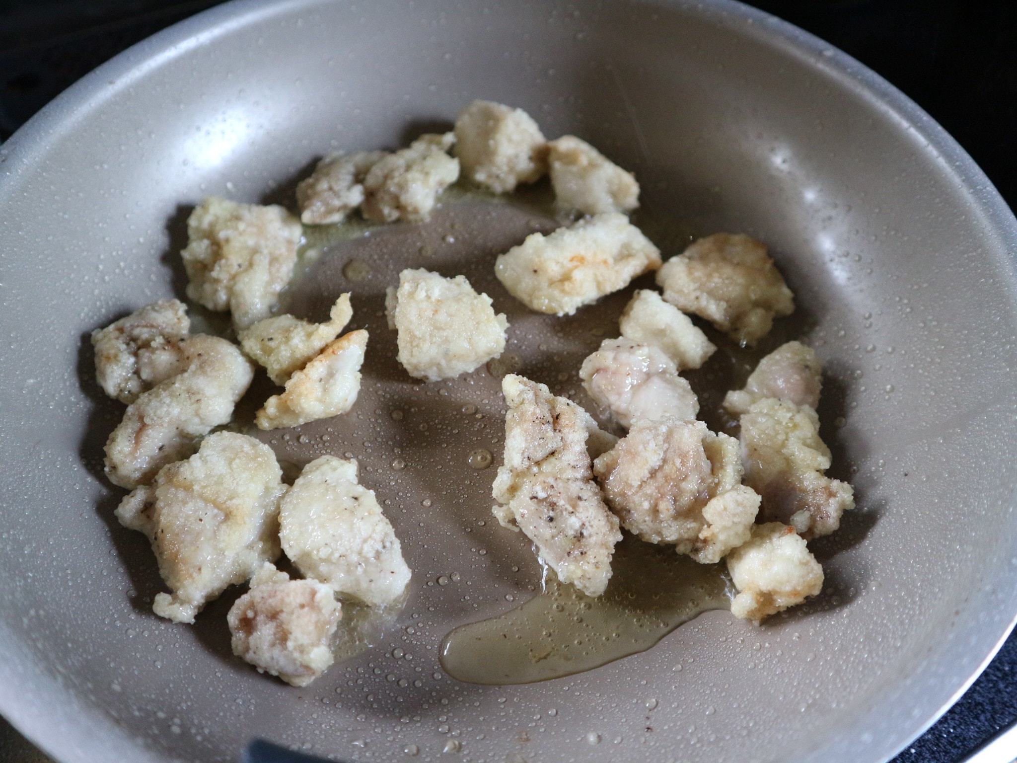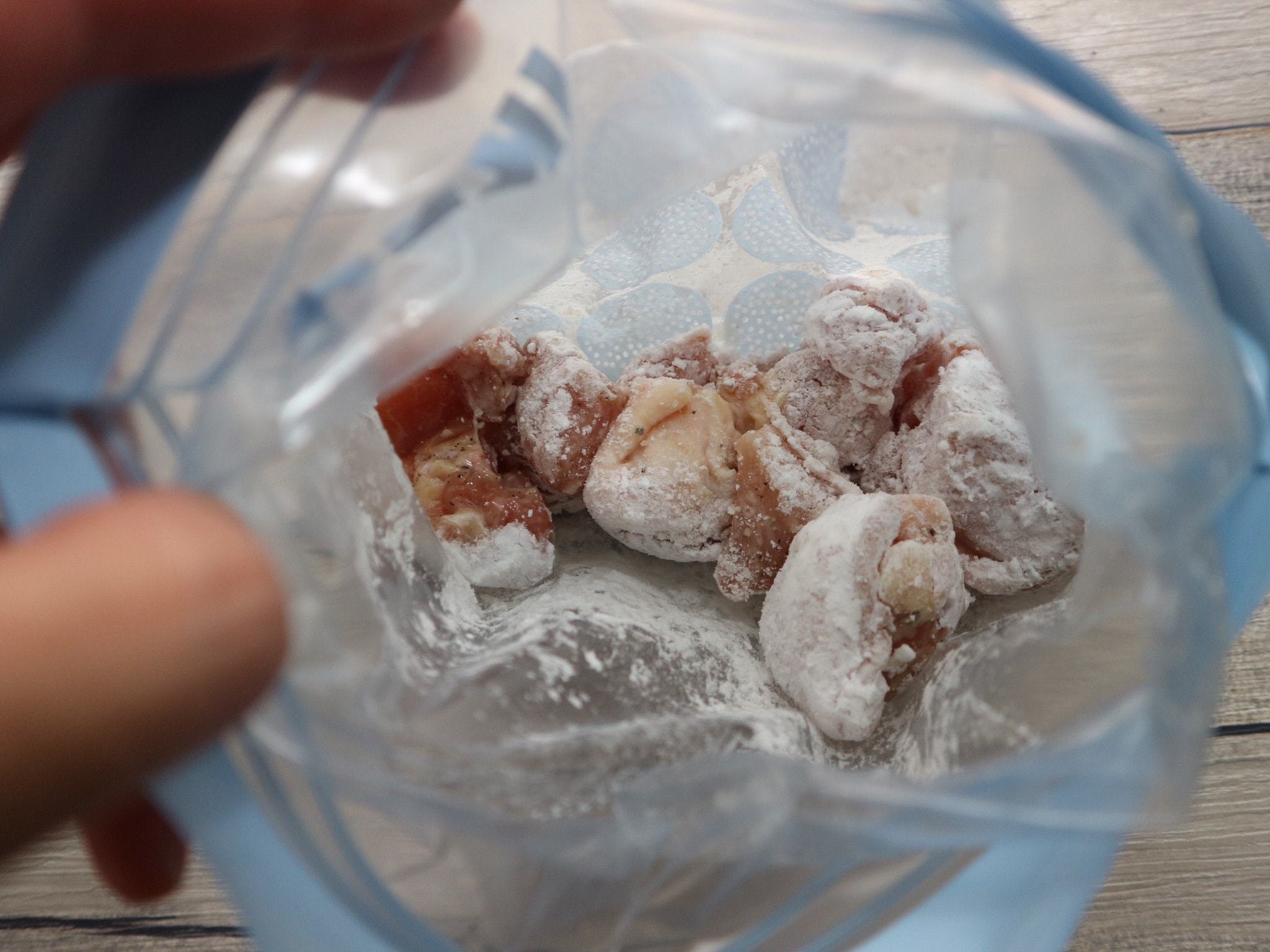 鶏もも肉と片栗粉を厚手のビニール袋に入れ、鶏もも肉に片栗粉がまんべんなく付くように振る。