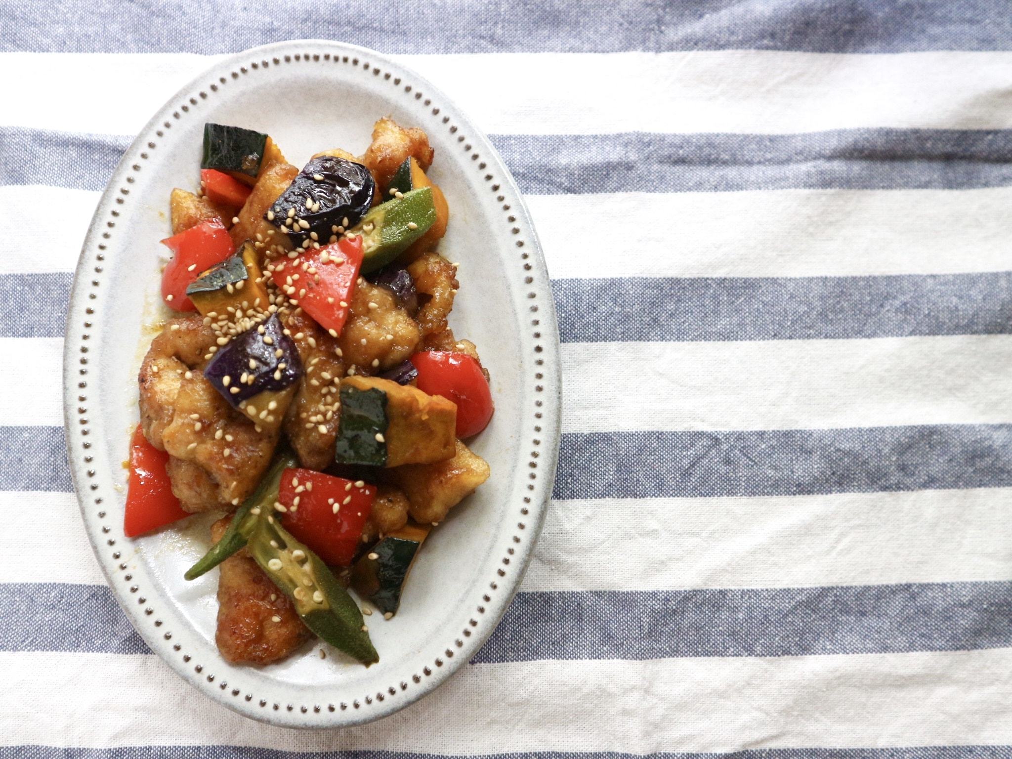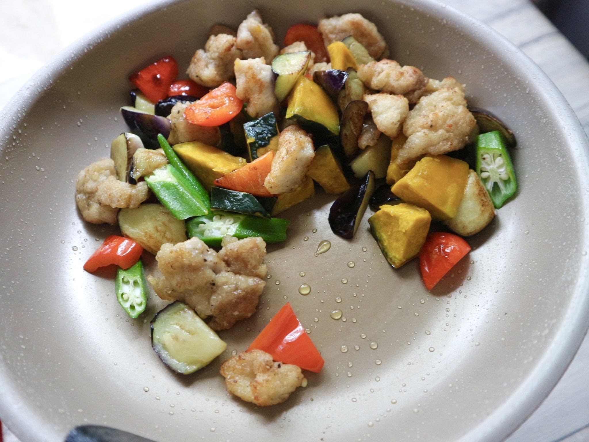 フライパンにサラダ油をしき②を入れ、表面がカリッとなるまで焼き、なす、赤パプリカ、かぼちゃ、オクラを順に加えてさっと炒める。