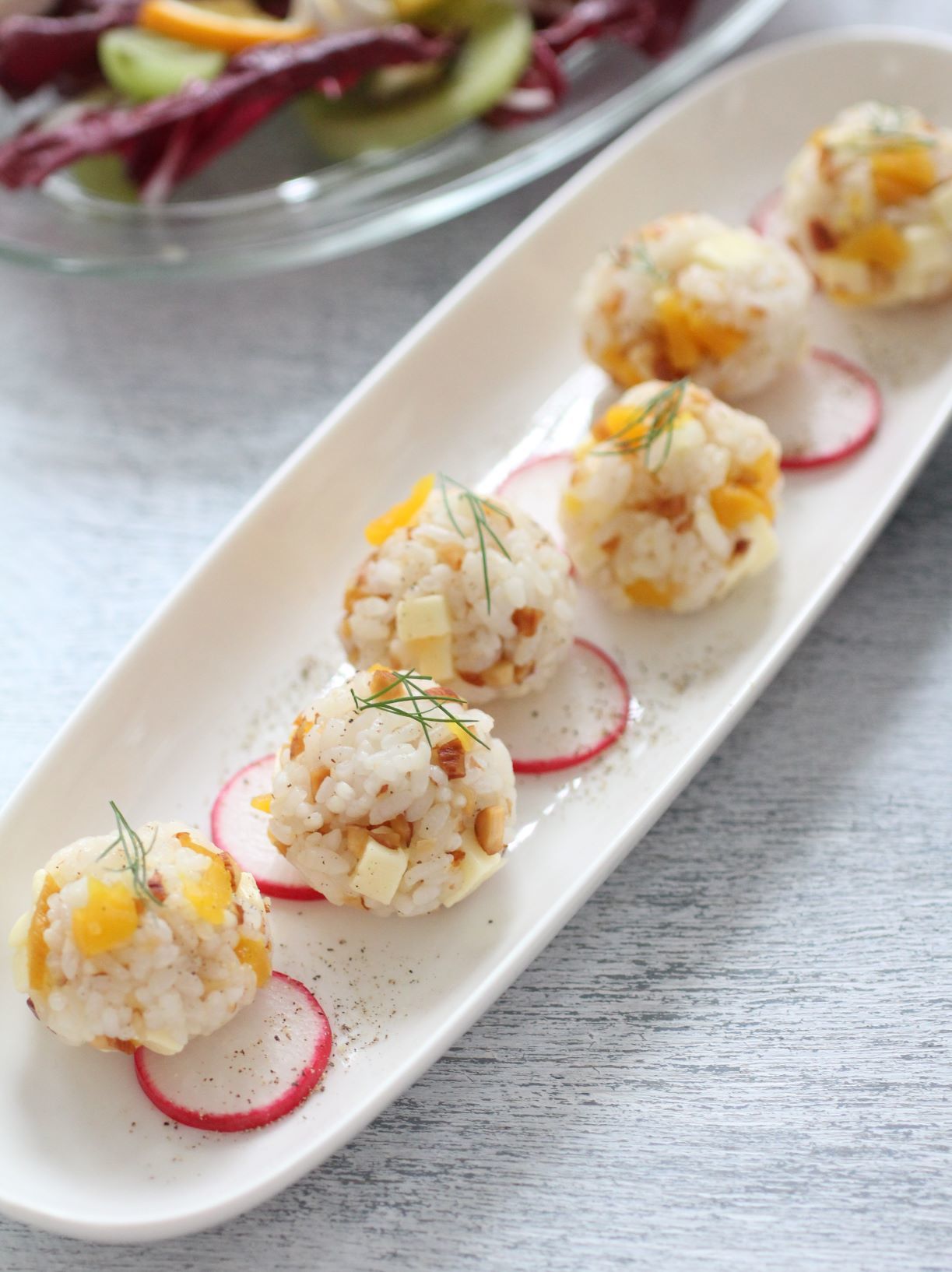 - 6等分して小さく丸め、器に盛り付けてディルをトッピングする。