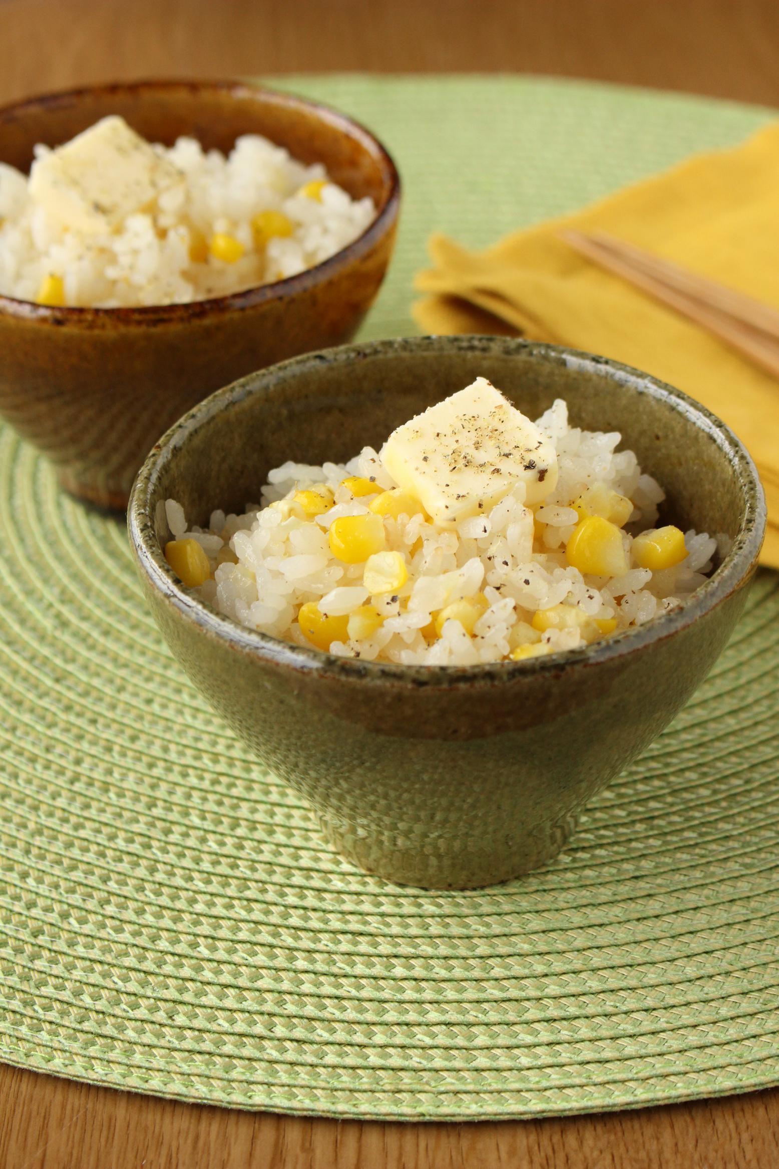 - 炊きあがったらとうもろこしの芯を除き、バター・こしょうを入れ混ぜ、器に盛る。
