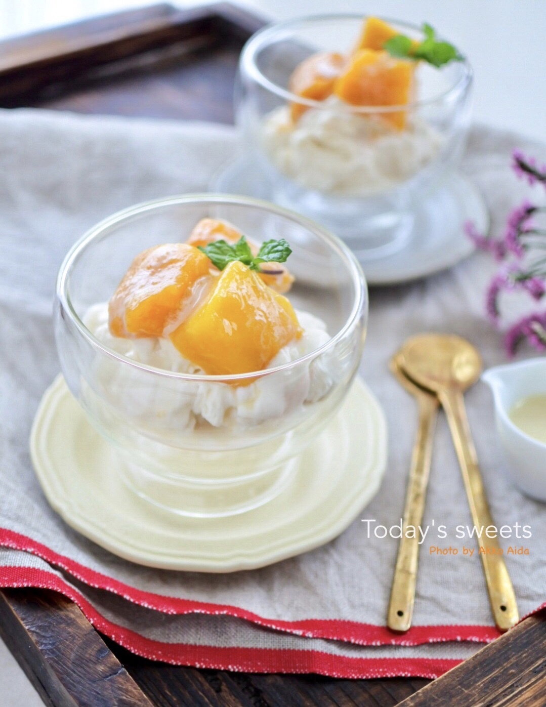 - 凍ったら器に盛り、マンゴーを乗せ、コンデンスミルクをかける。